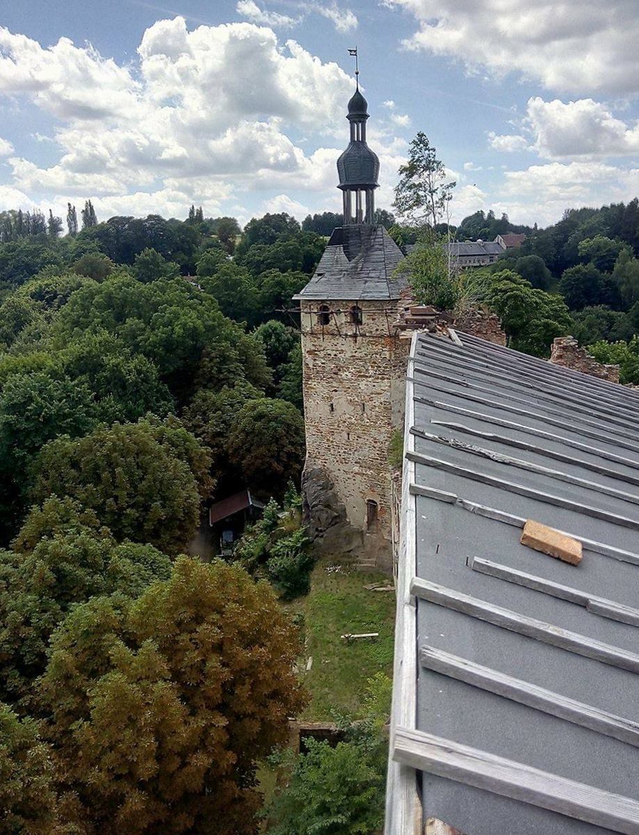 Věž v roce 1992 padla na oběť vandalům a byla úmyslně vypálena. Během let 2004-2007 se nám podařilo věž zastřešit. Výška hlásky je 27 m, uvnitř však chybí kvalitní schodiště . Máme v plánu do věže vystavět pěkné dřevěné schodiště částečně i z ručně tesaných trámů s mezipatry. Z finančních prostředků bychom zajistili nákup materiálu - dřevo, hřebíky,nátěry a výrobu prken a trámů a také zajistili položení kritiny ( břidlice) na zbývající část. Dále zajištění zabezpečení oken a částečně lešení . V současnosti věž není přístupná ,neboť nahoru se dostanete pouze po řebříkách. Pomozte nám splnit tento úkol a co nejdříve otevřít hradní věž veřejnosti a odhalit tak zcela nové hartenberské obzory !