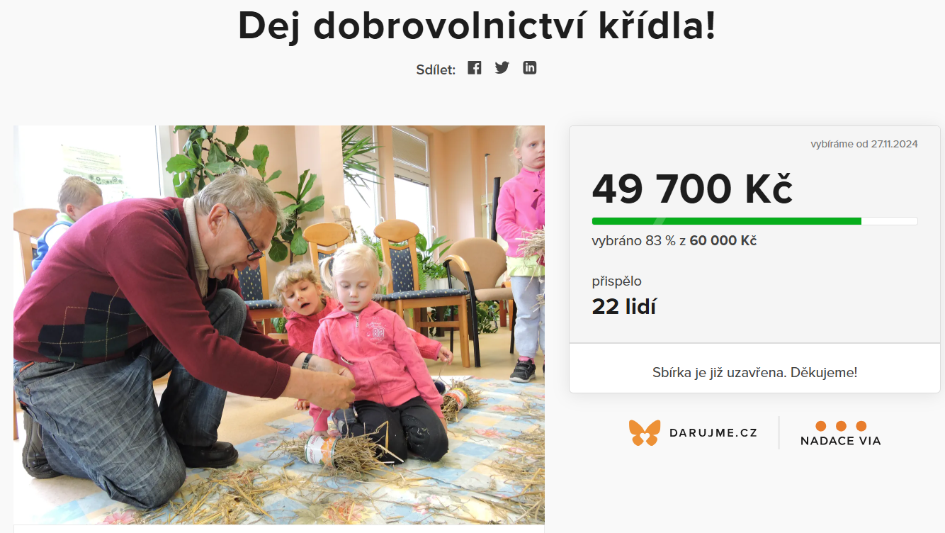 Z toho 49 700 korun přišlo na naši dárcovskou výzvu Dej dobrovolnictví křídla!, která byla součástí celosvětového dárcovského hnutí Giving Tuesday 2024 a dalších 16 tisíc nám dárci darovali přímým darem do pokladny.
