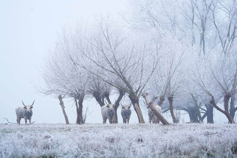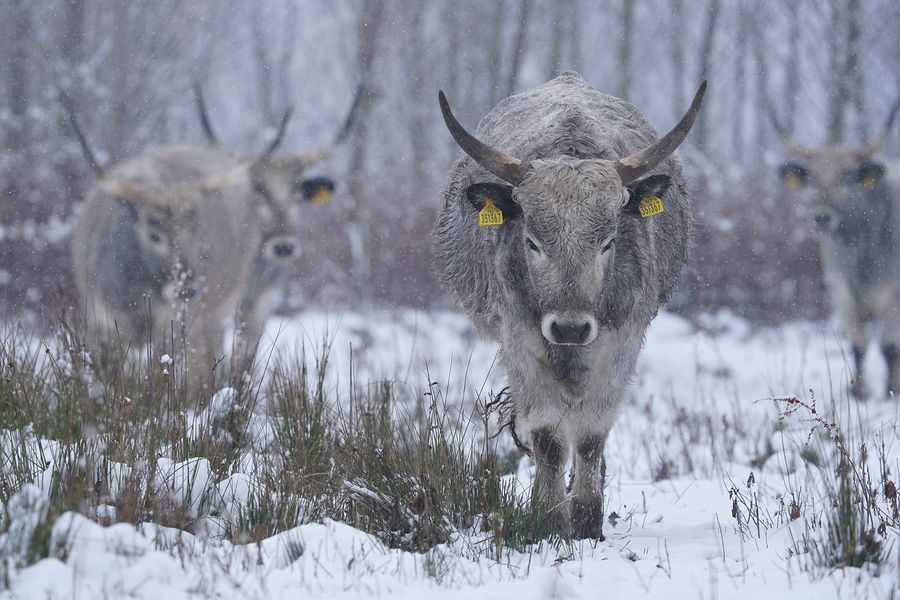V prosinci 2024 jsme v rámci projektu LIFE in Salt Marshes přesunuli na zimu trojici vodních buvolů ze Střední nádrže Vodního díla Nové Mlýny na zimoviště na Kosteliskách, kde buvolice nyní spokojeně vypásají další plochy mokřadů a vlhkých luk. V průběhu podzimu jsme si úspěšně vyzkoušeli také přehánění šesti krav uherského skotu (na fotografii) na delší vzdálenost a vypásali jsme nové plochy mokřadů na lokalitě U Šopy poblíž Ptačího pole. V rámci projektu z Programu péče o krajinu (PPK) jsme tu za asistence dobrovolníků z podzimní brigády ořezali desítky vrb. V novém roce jsme se vrátili, k již ořezaným vrbám a v rámci pravidelného ořezu je opět seřízli na hlavu. Část stromů v okolí tůně jsme ořezali a prosvětlili porosty.
