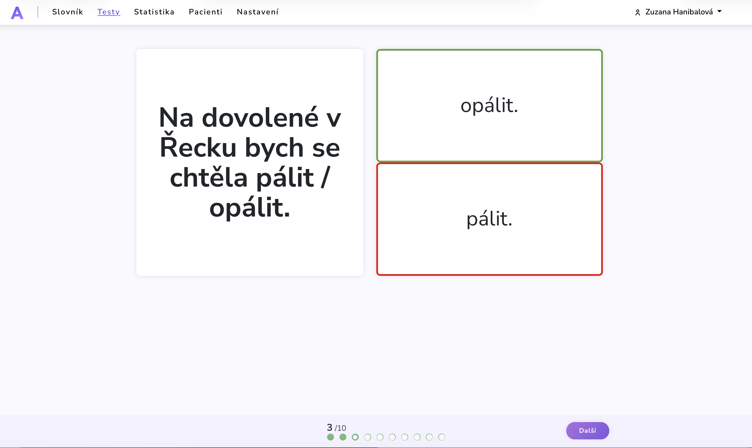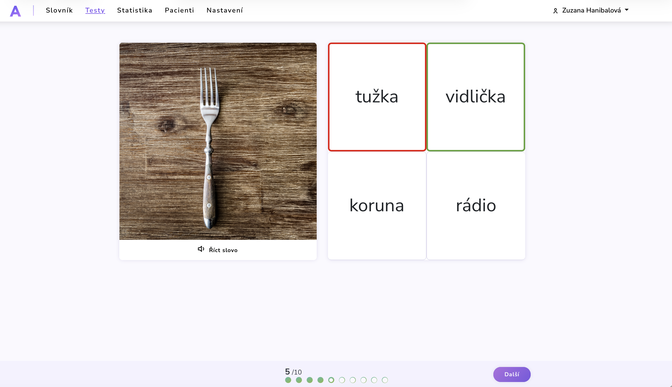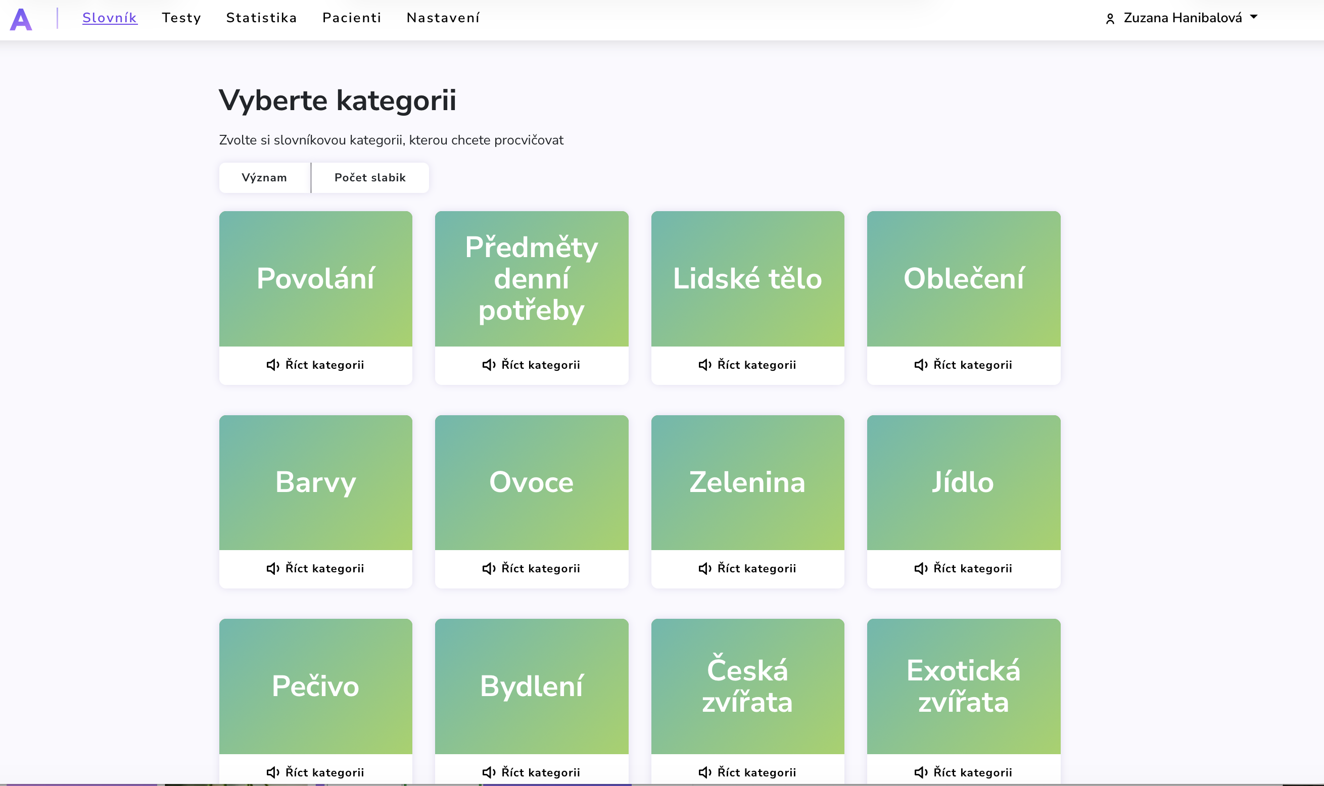 Proto jsme vyvinuli AfaSlovník, který zjednodušeně funguje jako Duolingo, učí pacienta znovu jeho mateřský jazyk. Umožňuje procvičovat řeč samostatně bez asistence logopeda, z pohodlí domova, a navíc zábavnou formou.
