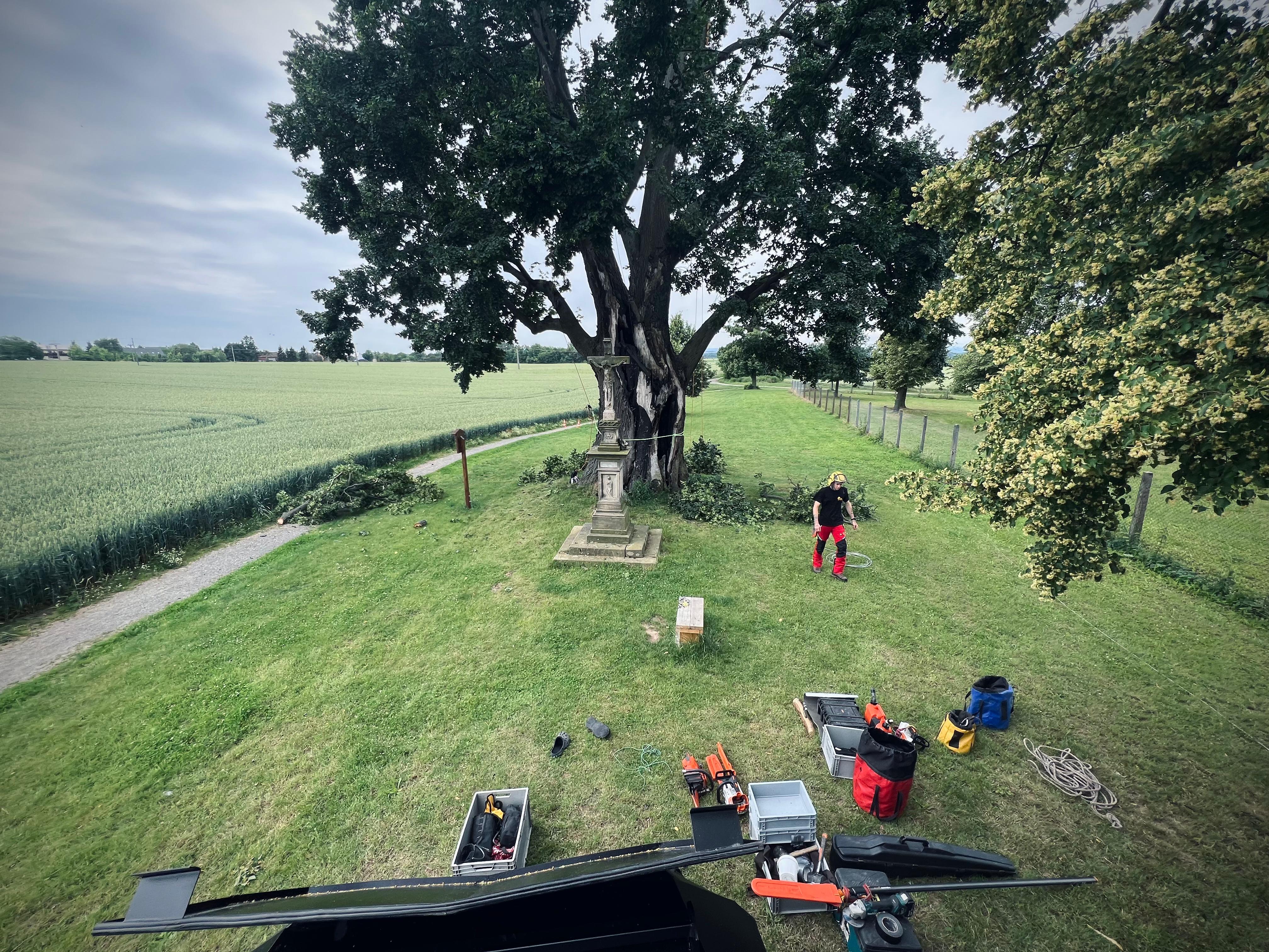 Novoveská lípa. Její koruna byla plná jmelí a její statická stabilita narušená kvůli dutému kmeni. Nic co by nespravila ozdravná kúra!
