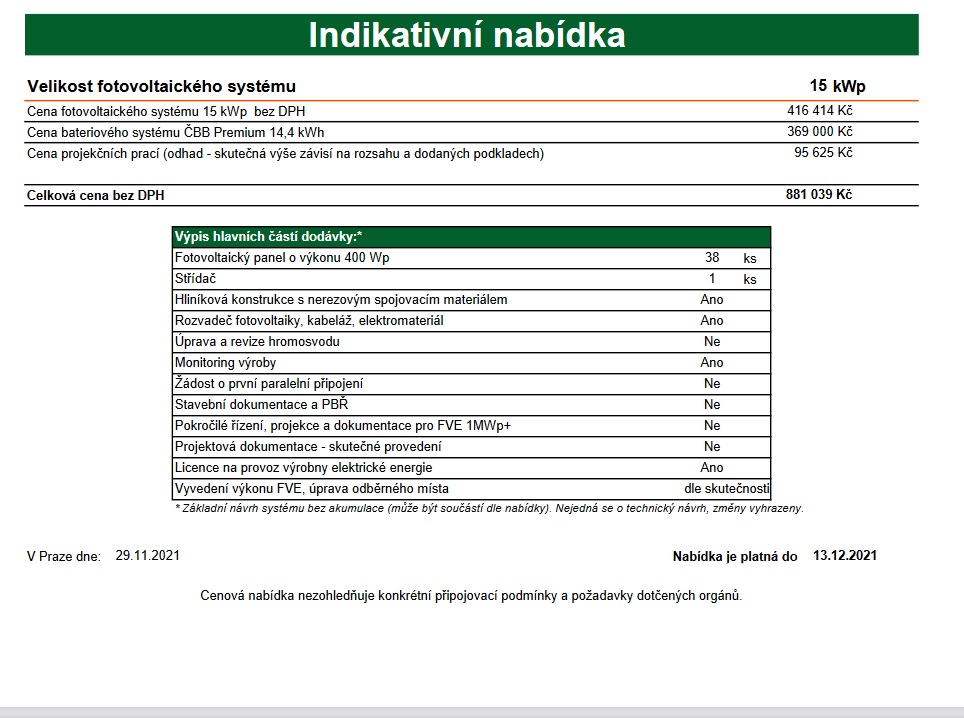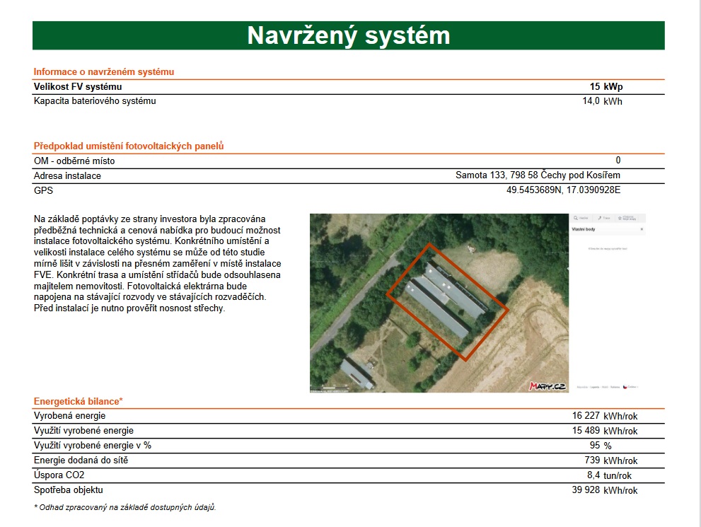 Indikativní nabídka fotovoltaické elektrárny os společnosti ČEZ ESCO pro společnost útulek pro psy Voříšek 25579649 Samota 133, 798 58 Čechy pod Kosířem Fotovoltaická elektrárna včetně bateriového systému ČBB Premium