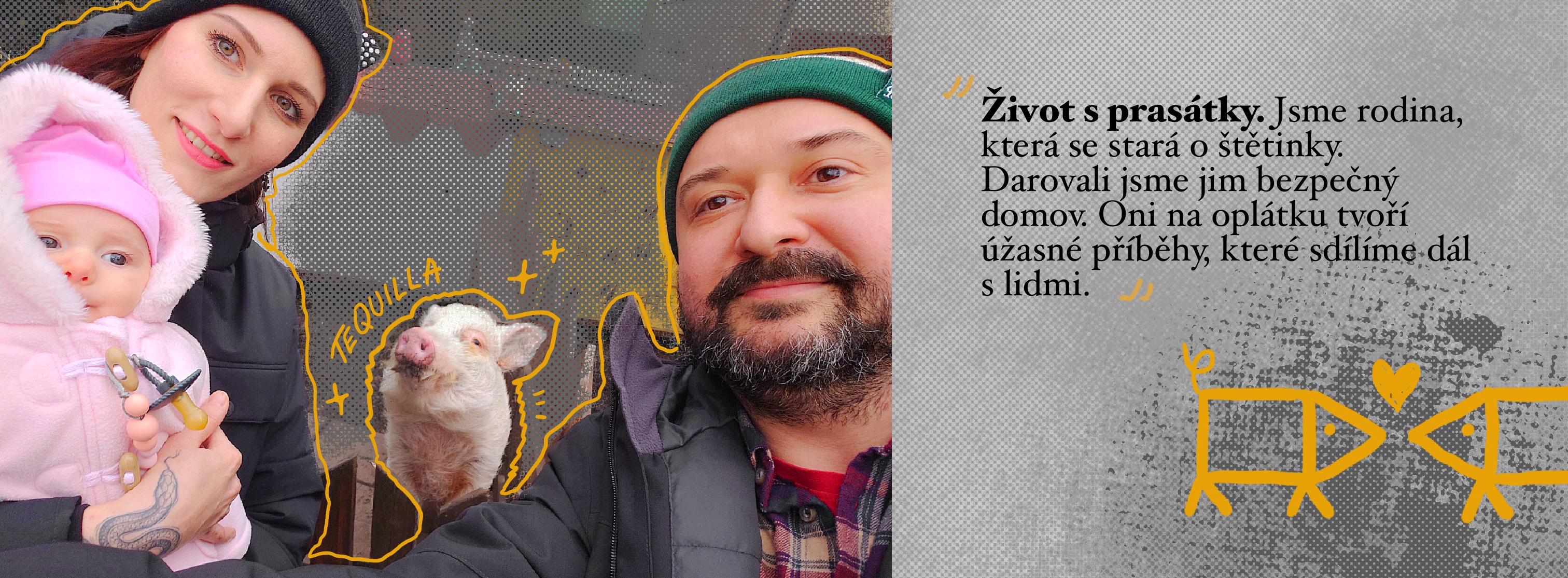 Kdo jsme? Dva milovníci prasátek. Jsme manželé s miminkem, kteří žijí na vesnici (tam, kde lišky dávají dobou noc) a provozují Azyl Štětinku. Vedeme skromný život, radujeme se z maličkostí, žijeme s prasátky.