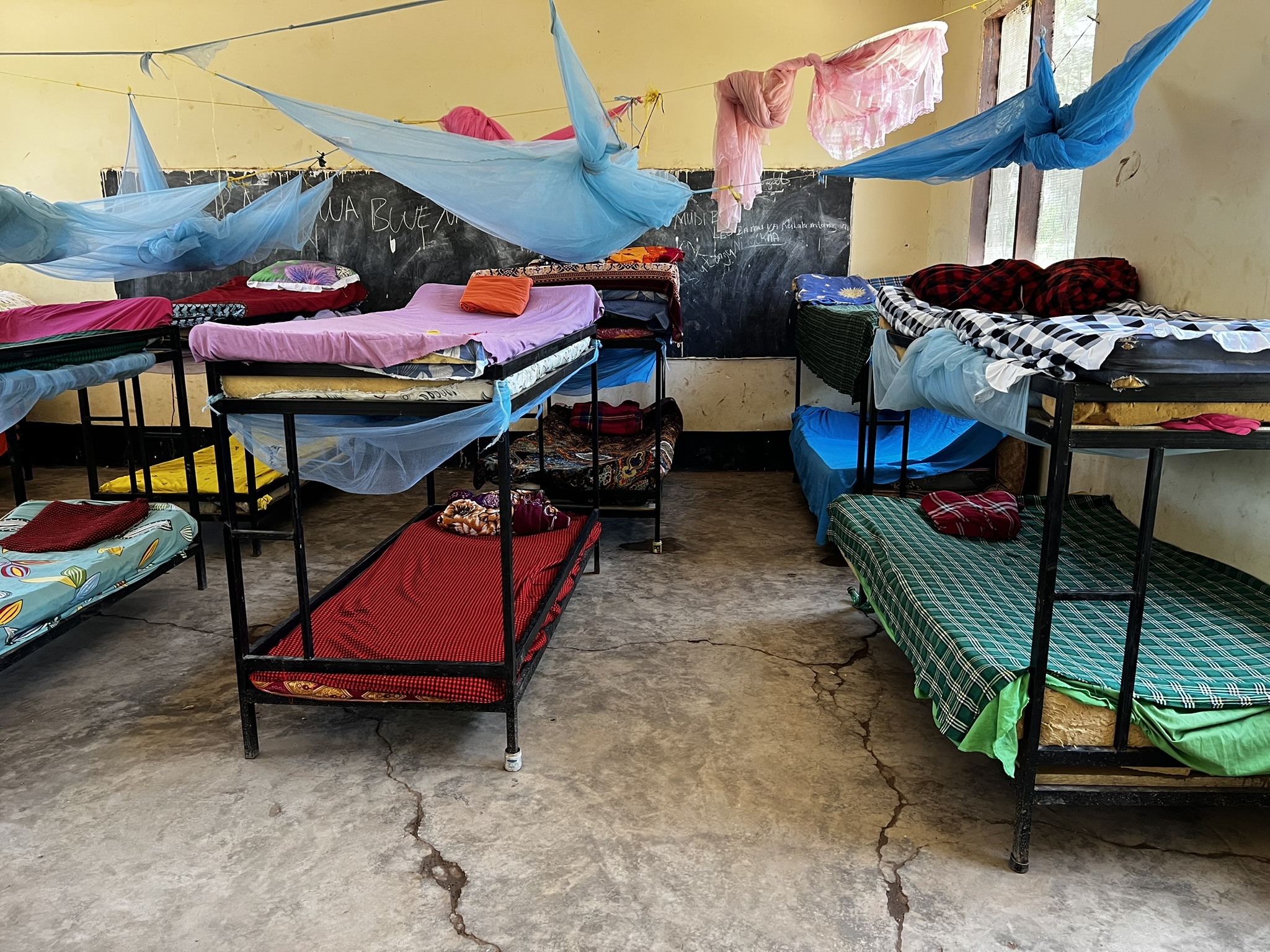 UBYTOVÁNÍ PRO CHLAPCE Nejedna se přímo o výstavbu nové ubytovny, ale využily se stávající budovy, které nebyly dokončeny a původně měly sloužit jako třídy. Bylo efektivní využít právě je, stačilo udělat podlahy, omítky, stropy a výmalbu. Okna se řešila jednoduchým "africkým" způsobem: mříže a hustá síta proti hmyzu a hlodavcům.