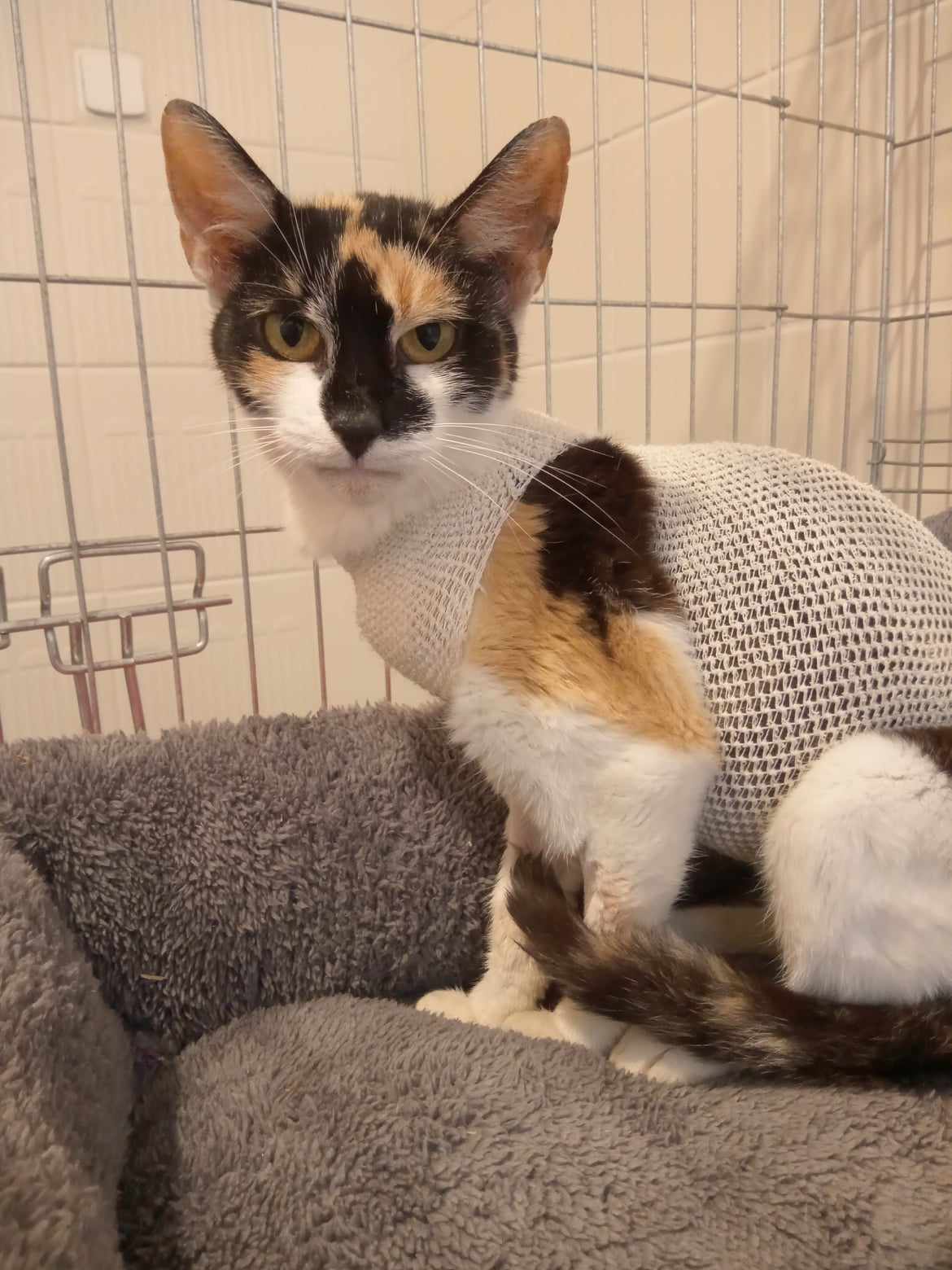 When an adopter of ours calls to say they found a pregnant cat in need, how could we say no? Really thin, hip bones prominent, no meat on her bones. With a big belly. On Thursday we took her to our vet for an ultrasound. She wasn't pregnant, we were told she had enlarged kidneys and her blood work was terrible, our vet thought she might have FIP. She was hospitalised overnight.