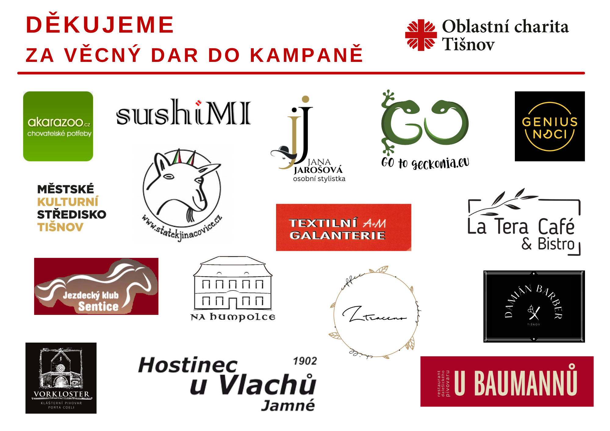 Finanční dar je možné zaslat na: číslo účtu: 185897781/0600 variabilní symbol 2412 nebo přispět pomocí tlačítek vpravo (včetně platby kartou) Finanční dar může být jednorázový, ale i pravidelný trvalým každoměsíčním příkazem. Pro nákup dárkových poukázek na e-shopu navštivte eshop.tisnov.charita.cz, kde lze zakoupit dárkové poukázky do restaurace, na pivo, na nákup pamlsků pro čtyřnohé přátele nebo třeba do kuřimského sushi bistra.