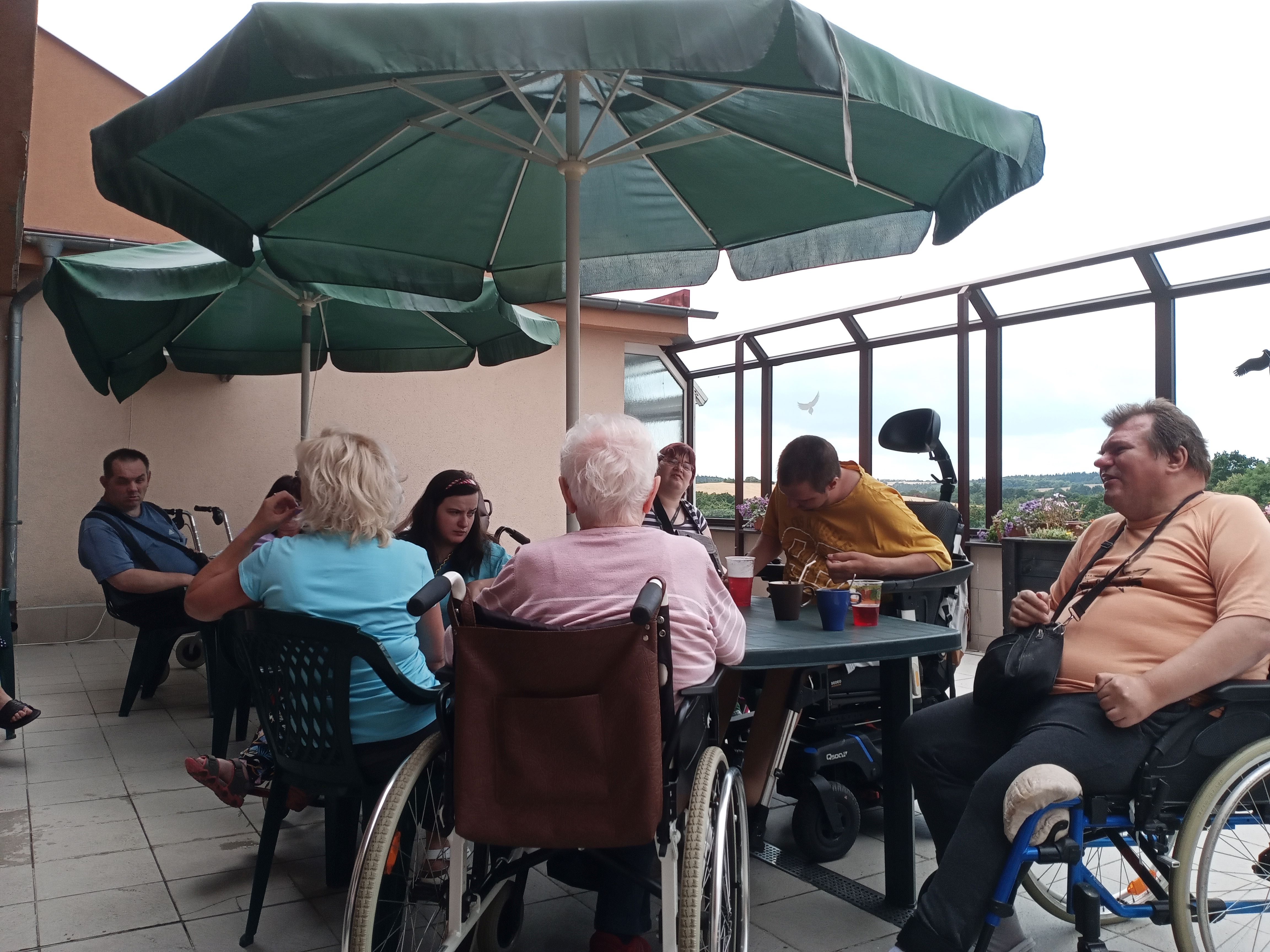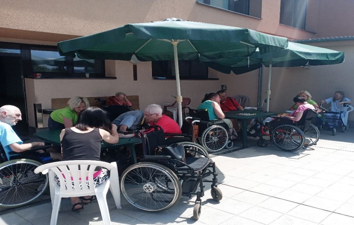 V letním období klienti CSS Hrabyně využívají prostory terasy nejen k odpočinku, ale také zde využívají prostor k volnočasovým aktivitám – zpívání, čtení, společenské hry, posezení si s přáteli a trávení času s rodinou. Posezení pod slunečníkem zaručuje našim klientům příjemný stín i ochranu před letním deštěm.