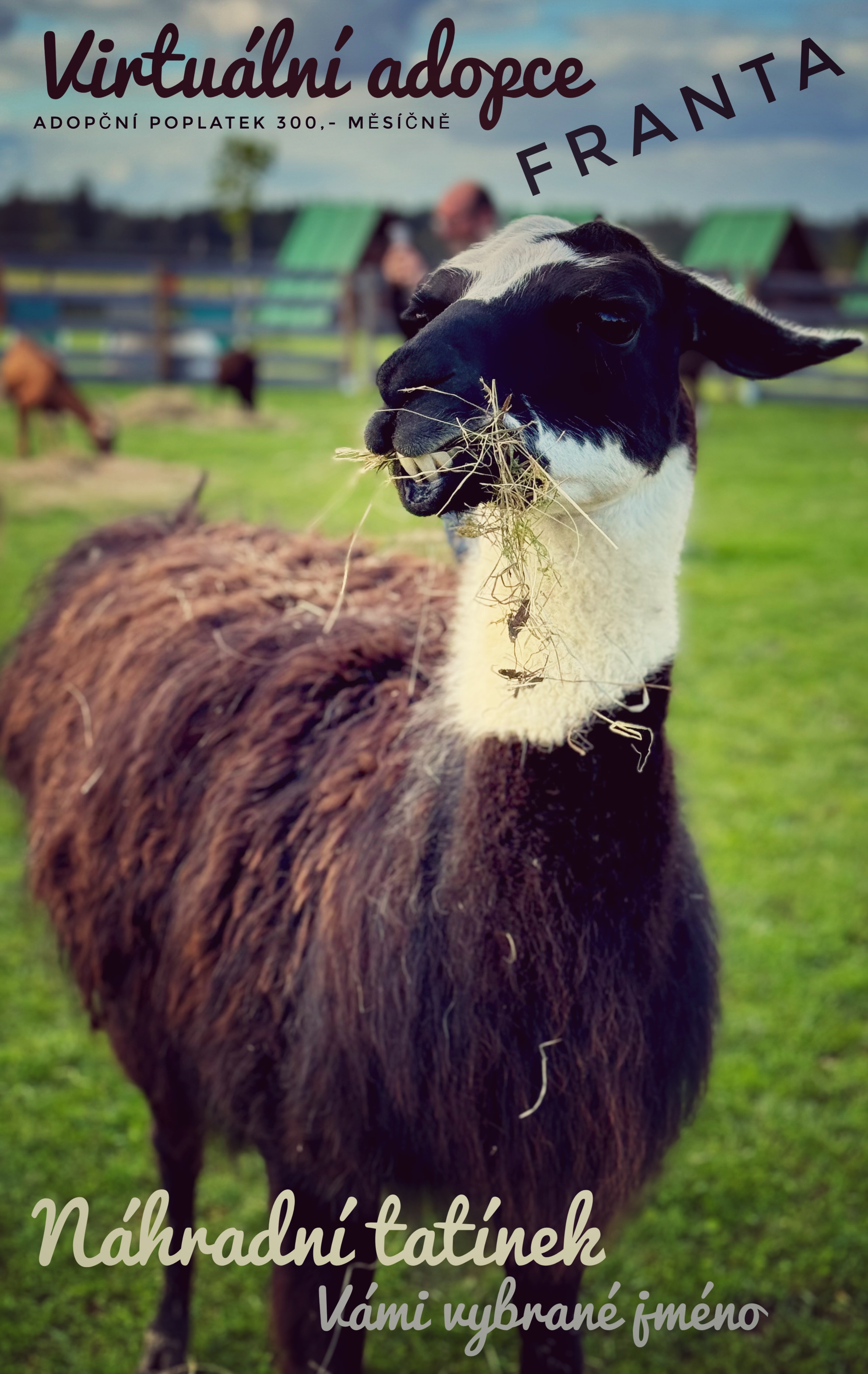 Byl to dárek k narozeninám, ale paní, která byla obdarovaná, také zachraňovala srnky a ty, když Frantu uviděly, začaly tak panikařit a skákat do oplocení, že to vypadalo, že si polámou vaz. A tak milý 5letý nevykastrovaný Frantík zůstával v přepravníku a nemohl ven. Nám zavolala Aneta z azylu Šťastný zvěřinec, který byl jako první oslovený, zda by klukovi dali domov. U nich je to maličké a nešlo by to, tak zavolali k nám, protože jsme jediný azyl, který má také lamičky. Se jménem František už přišel a tak mu zůstalo a my mu říkáme občas František Dobrota, i když teda na začátku nám tak proháněl ovečky, že jsme si mysleli, že u nás nebude moci zůstat. Doufali jsme, že ho kastrace více zklidní, ale stejně nic moc a tak jsme začali hledat domov jinde. A jakoby to tušil, už když dostal několik šancí, že se třeba napravil a všechny moc nedopadli, tak u té poslední, kdy už byl i domluven termín převozu a my si řekli, ok Franto, pojď ještě jednou, máš poslední šanci, zda ses polepšil…. a my koukali s otevřenou pusou, jakoby to byl jinej uvědomělej lamáček. Byl hodnej, nikoho nehonil a tak jsme převoz pozastavili, že počkáme, zda se nám to opravdu nezdá. Nezdálo a my jsme za to moc rádi. Přeci jen je to takovej týpek s charakterem a byla by škoda, kdyby zase odjížděl a musel si zvykat na nový domov. Teď je asi největší kámoš s Vesnou, přeci jen je to holka, tak na něj doráží a on si to dost užívá.