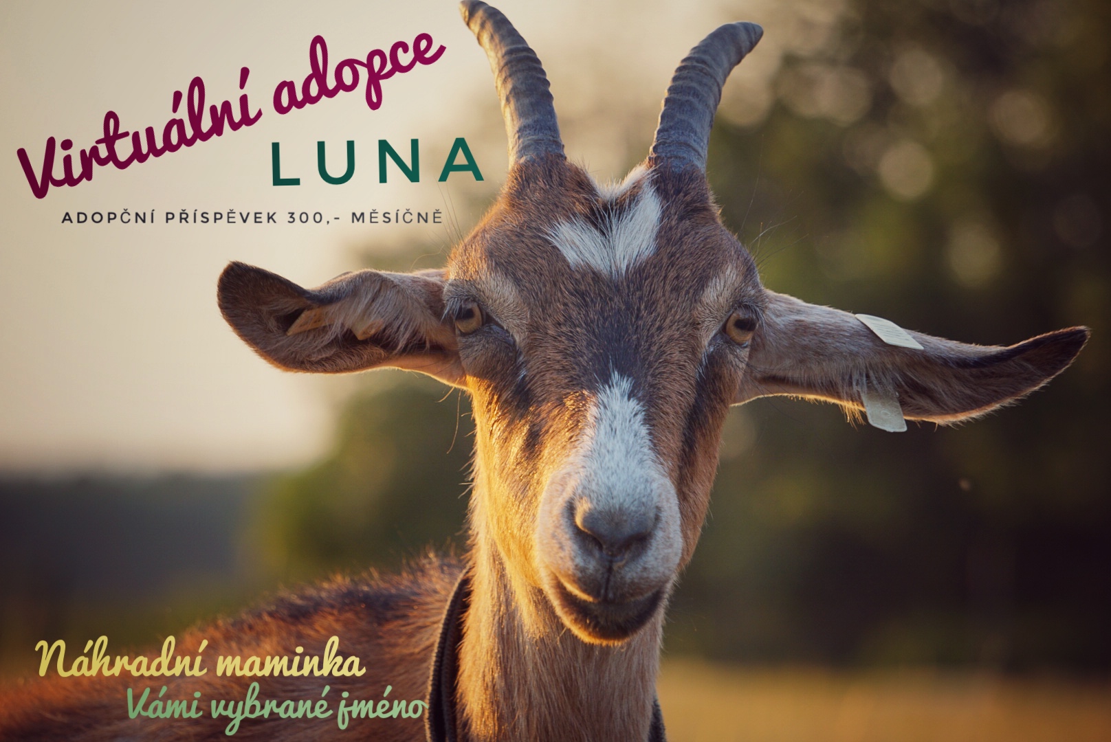 Ahoj světe, já jsem Luna, takový krásný jméno mi dali lidi z farmy, který pro mě tenkrát přijeli a zachránili mi život. Prý mám lunu na čelíčku a ještě jsem s ostatníma kozičkama spásala pastviny u Loun, tak bylo o mém jménu rychle rozhodnuto.