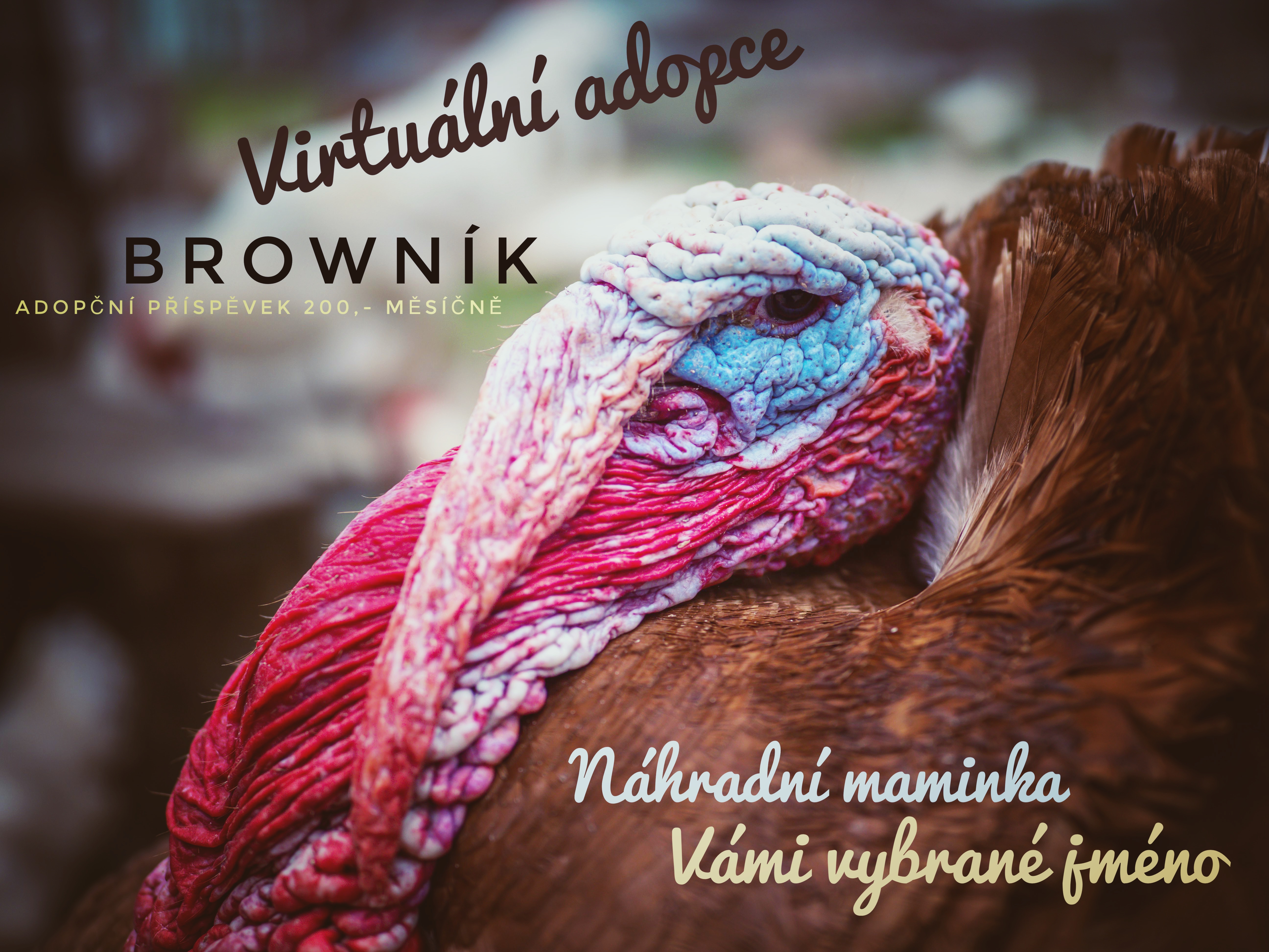 Tenhle vtipnej krasavac nám tady kouzlí úsměvy na tváři už přes 5 let. Byl ve skupince 8 zachráněných krůtiček a krocanů. Hodně se nám mezi sebou prali a bylo to hlavně krocani kvůli přízni holek. Tak jsme se rozhodli zkusit dát holky do azylu Ponto a byly jsme rádi, že bylo u obou vše v pohodě a kluci se hodně zklidnili. Bohužel černí kluci začali odcházet, každý kvůli něčemu úplně jinému a zbyl tu sám Browník. Byli dříve všichni pohromadě u velkých zvířat a spali ve výběhu u oveček, ale tím, že Browník zůstal sám, vzali jsme ho k sobě dopředu, kde je teď s celou naší svatou čtveřicí :D (Alešek, Einstein, paní Bačkůrková a samozřejmě Marťa). Od té doby často koukáme s úžasem, jakou má osobnost a jak je neskutečný, jak se od sebe povahově liší a jsou jedineční. Jako u nás lidí. Miluje společnost lidí, hned za nimi běží, hlavně za těmi, co je vidí poprvé a naparuje se jako divej. Když děláme oheň, musí tam být vždy s námi a chodí okolo a ukazuje svoji majestátnost. Taky rád tančí, mrkněte na IG do storíček. Moc nás ten kluk baví.