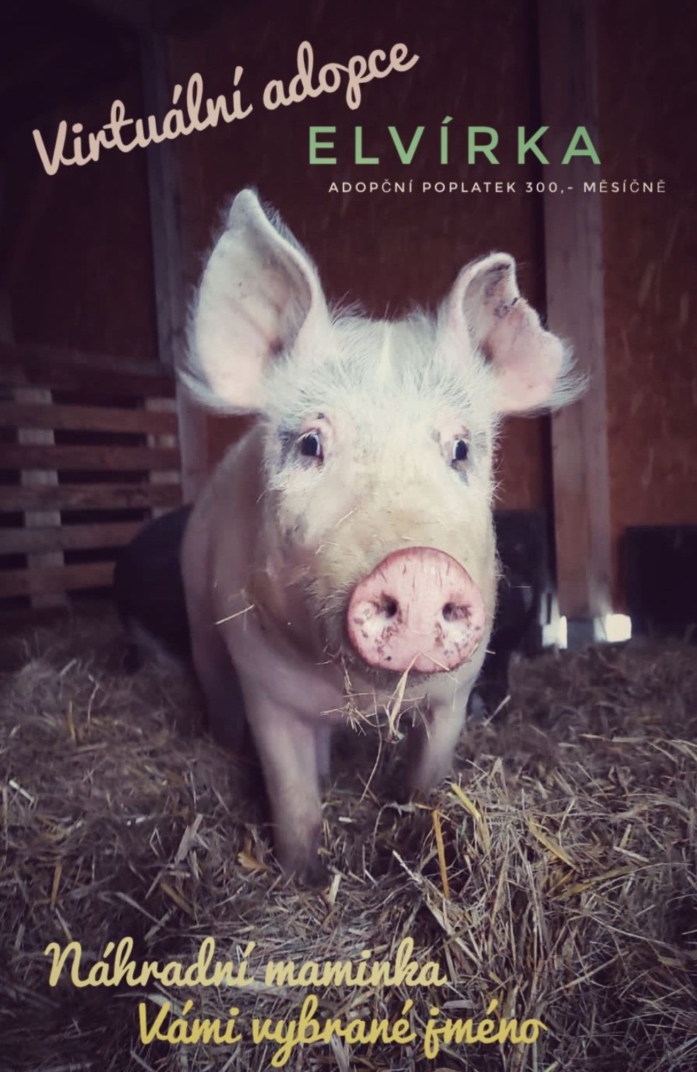 Elvírka byla zachráněná z velkochovu ještě se sestřičkou Emičkou, která bohužel po kastraci měla kýlu a při reoperaci se nám již neprobudila z narkózy. Obě holčičky měly kolem 1,5 kila a obě miminka se daly nést v jedné ruce. Obě byly ještě asi 2 měsíce na mlíčku, než začaly papat tuhou stravu a milovaly pozornost a mazlení. Odchod Emičky nás moc zasáhl, ale Elvírka se naštěstí hned zkamarádila se všemi ostatními prasátky a vypadalo, že nesmutní. Ten den, kdy jsme zachránili Elvírku, tak tu byli na teambuildingu pracovníci z firmy Econea, kteří maličké dali tohle jméno. Děkujeme.