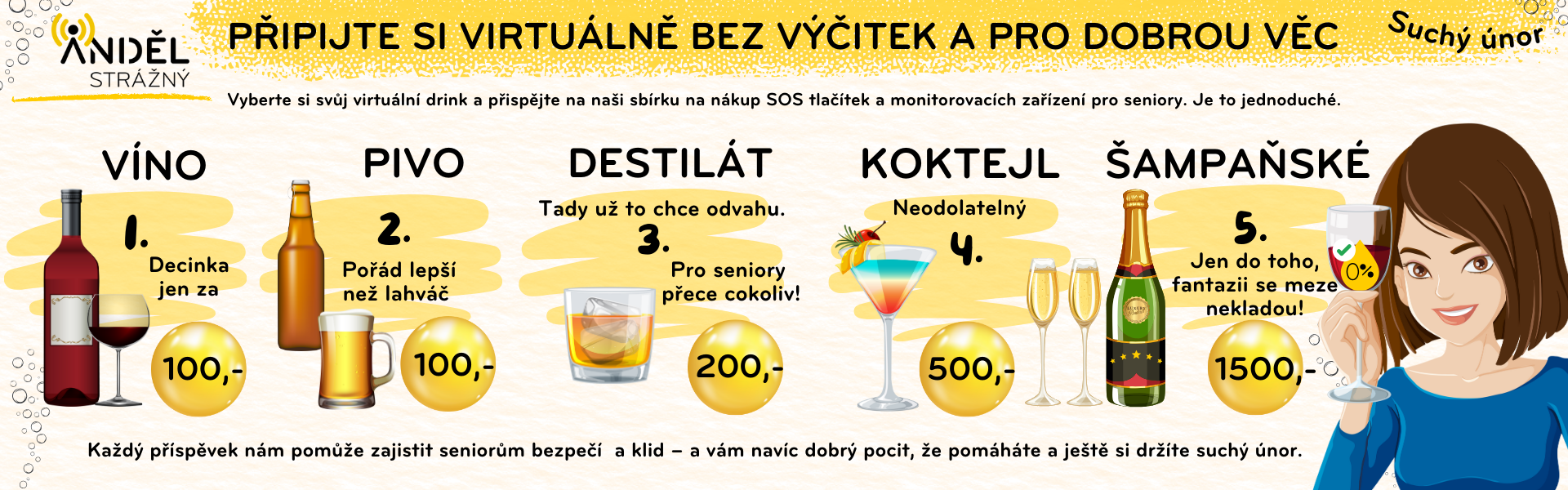 Každý příspěvek nám pomůže zajistit seniorům bezpečí a klid – a vám navíc dobrý pocit, že pomáháte a ještě si držíte suchý únor. Celý výtěžek použijeme na nákup SOS tlačítek a dalších zařízení, která pomáhají seniorům žít bezpečněji. Přidejte se k nám, podpořte dobrou věc a připijte si na zdraví – ať už své nebo našich klientů.
