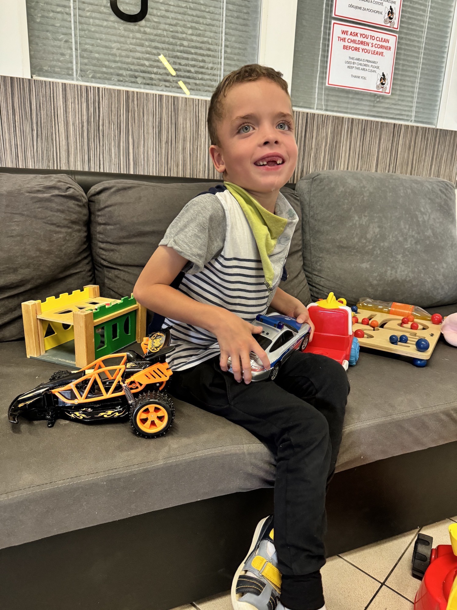 Co mě fakt nebaví, tak jsou pořád kontroly u doktorů, nechutnají mi léky a doplňky stravy, které musím několikrát denně jíst a vždycky si hůře zvykám na nové pomůcky, které třeba v botách musím nosit. Jenže když už je naši zaplatili, tak co mi zbývá, že … Stále na sobě pracuji – naučil jsem se chodit za ruku a snažím se vynechávat vožení se v kočárku, učím se sám jíst, pít, oblékat, ale stále mi naši musí pomáhat. I nadále mám plno plánů, co musím ještě zvládnout, naučit se. Nechci chodit za ruku, chci běhat. Chci chodit na záchod jak velcí kluci a zbavit se plínek, chci mluvit, malovat, orientovat se v tomto světě. Prostě nechci, abych byl 24/7 na někom závislý, jako dosud. Často si všímám obavy rodičů, jestli na všechnu péči o mě budou mít dostatek peněz. Ale pak se vždy zase smějí. Tak si říkám, že asi přišel nějaký anděl, který rodičům pomohl. Proto moje velké přání je, aby tito andělé s námi byli i nadále a mamča s taťkou měli aspoň o jednu starost méně. Z celého svého srdíčka jim Všem budu vděčný a všem, kteří nám s tím pomáhají a dál „na sobě budu makat“, abych mamce a taťkovi dělal radost a mohl třeba jednou běhat s klukama na hřišti.