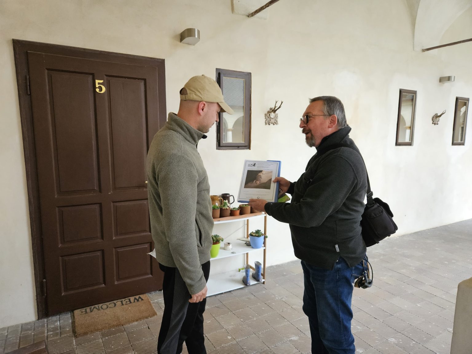 160. PAMÁTEČNÍ PLAKETA NÁŠ SOUSED JE NETOPÝR Nedávno jsme jubilejní plaketu předali na zámku v Rudě nad Moravou. Zdejší půdu využívá jako úkryt letní kolonie netopýrů velkých (Myotis myotis) a také vrápenců malých (Rhinolophus hipposideros). Zámek je jednou z evropsky významných lokalit chráněných v rámci soustavy Natura 2000, ale zároveň i významnou kulturní památkou. Aby bylo možné ochránit historické trámy a zároveň usnadnit budoucí uklízení trusu po letních koloniích, byly zde v letech 2022-2025 postupně instalovány ochranné podlážky a stříšky na trámy. Toto poměrně rozsáhlé opatření bylo realizováno díky příkladné spolupráci majitele zámku, pana M.E.ng. Michala Rozumného a členů ČESON, a také díky finanční podpoře v rámci mezinárodního projektu LIFE+ PODKOWIEC TOWERS, jehož byl ČESON partnerem.