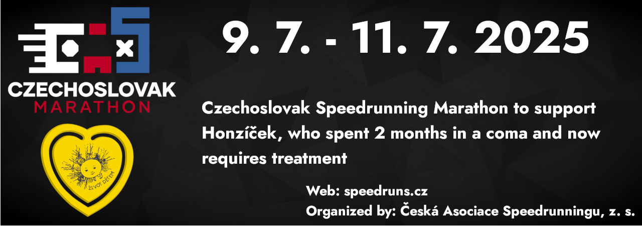 Česká Asociace Speedrunningu, z. s. organizes a speedrunning marathon to support Honzík on Twitch.tv. Any donations received through Darujme will be read out on the live stream and you'll be rewarded with entertaining content. More information on their website: https://czechoslovak-marathon.cz. You can watch the live stream on https://www.twitch.tv/czechoslovak_marathon