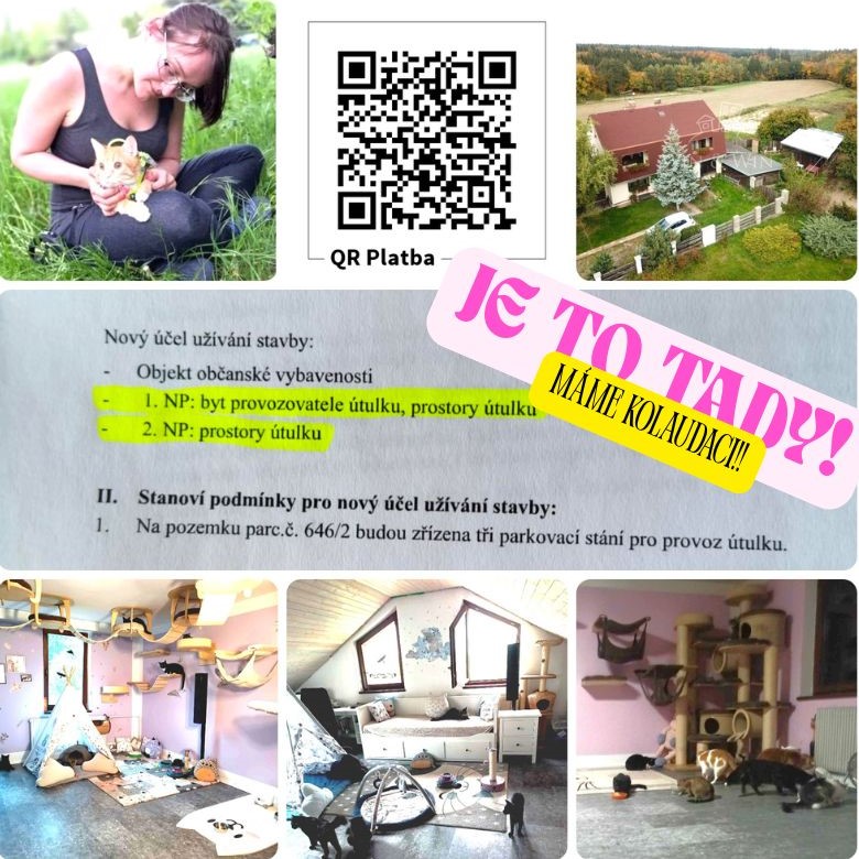 Přátelé, podporovatelé a zvířecí rodinko. Od konce roku 2024 jsme oficiálně rekolaudovaným útulkem v registru Státní veterinární správy. Máme celá dvě patra kočičích pokojíčků, chceme vybudovat zázemí pro domací drobná hospodářská zvířata v nouzi a holuby, voliéry pro kočky a rádi bychom se rozšířili. Nejdříve však potřebujeme vybudovat zázemí u nás a zrekonstruovat stávající. Na to potřebujeme pomoc! Čim více prostoru bude uzpůsobeno zvířatům, tím více jich dokážeme pomoci.