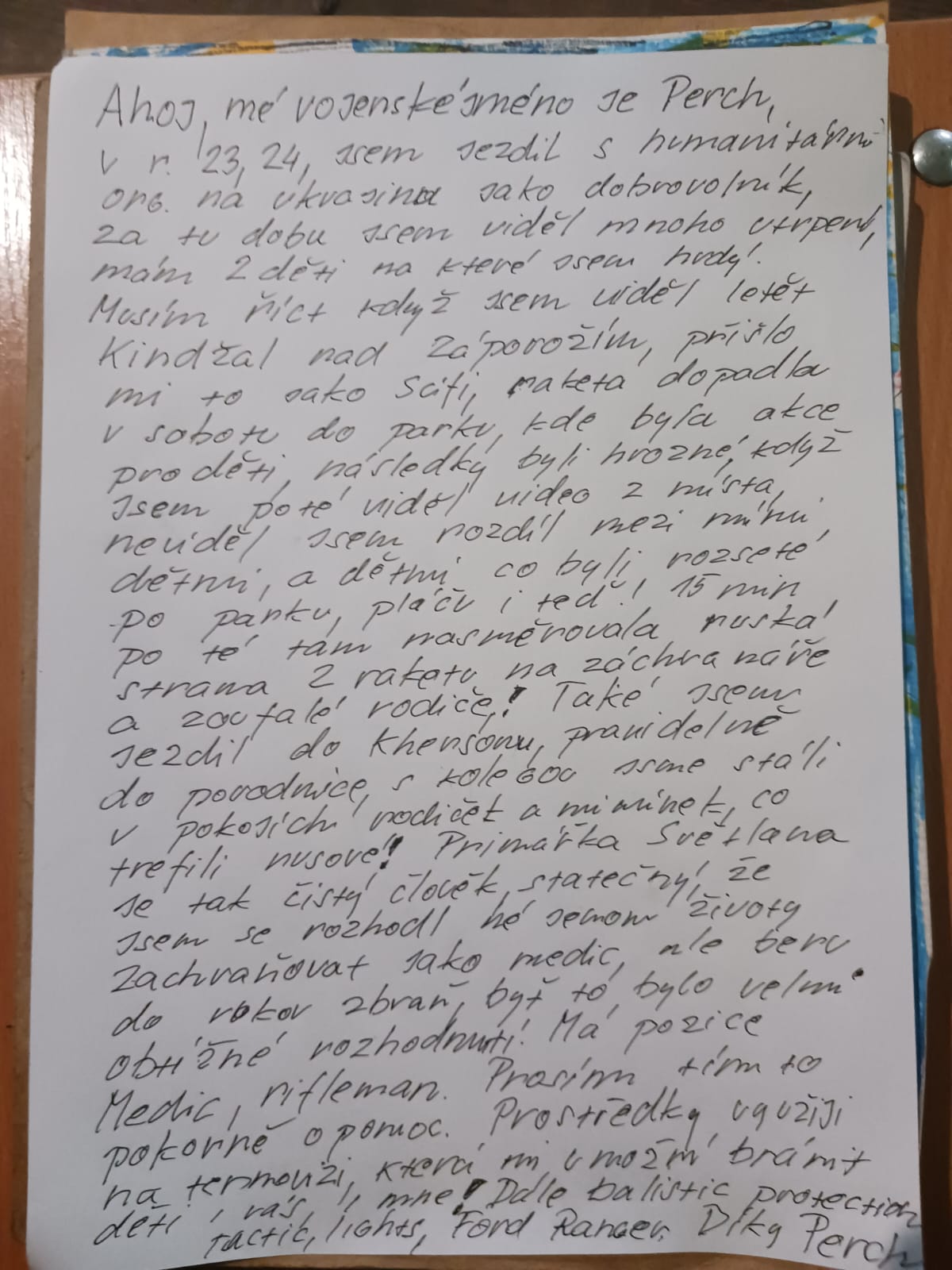 Perch je bývalý řidič humanitární organizace, jezdil kamionem na Ukrajinu. Při svých cestách viděl a spolu s Ukrajinci prožil nejednu hrůzu. To ho motivovalo ke vstupu do Ukrajinské mezinárodní legie jako combat medic. Nyní od nás potřebuje pomoci s nákupem vybavení, které mu zvýší šance na přežití při plnění svěřených úkolů.