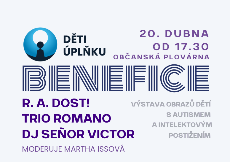 I letos v dubnu, v měsíci autismu, jsme se rozhodli uspořádat komunitní večer pro přátele Dětí úplňku a hudby. Tentokrát se můžete těšit na kapelu R.A.DOST s hvězdou filmu Karavan, Davidem Vodstrčilem, gipsy krále TRIO ROMANO a afterparty s DJ Señorem Victorem. Součástí benefice bude výstava obrazů od dětí s autimem a intelektovým postižením.