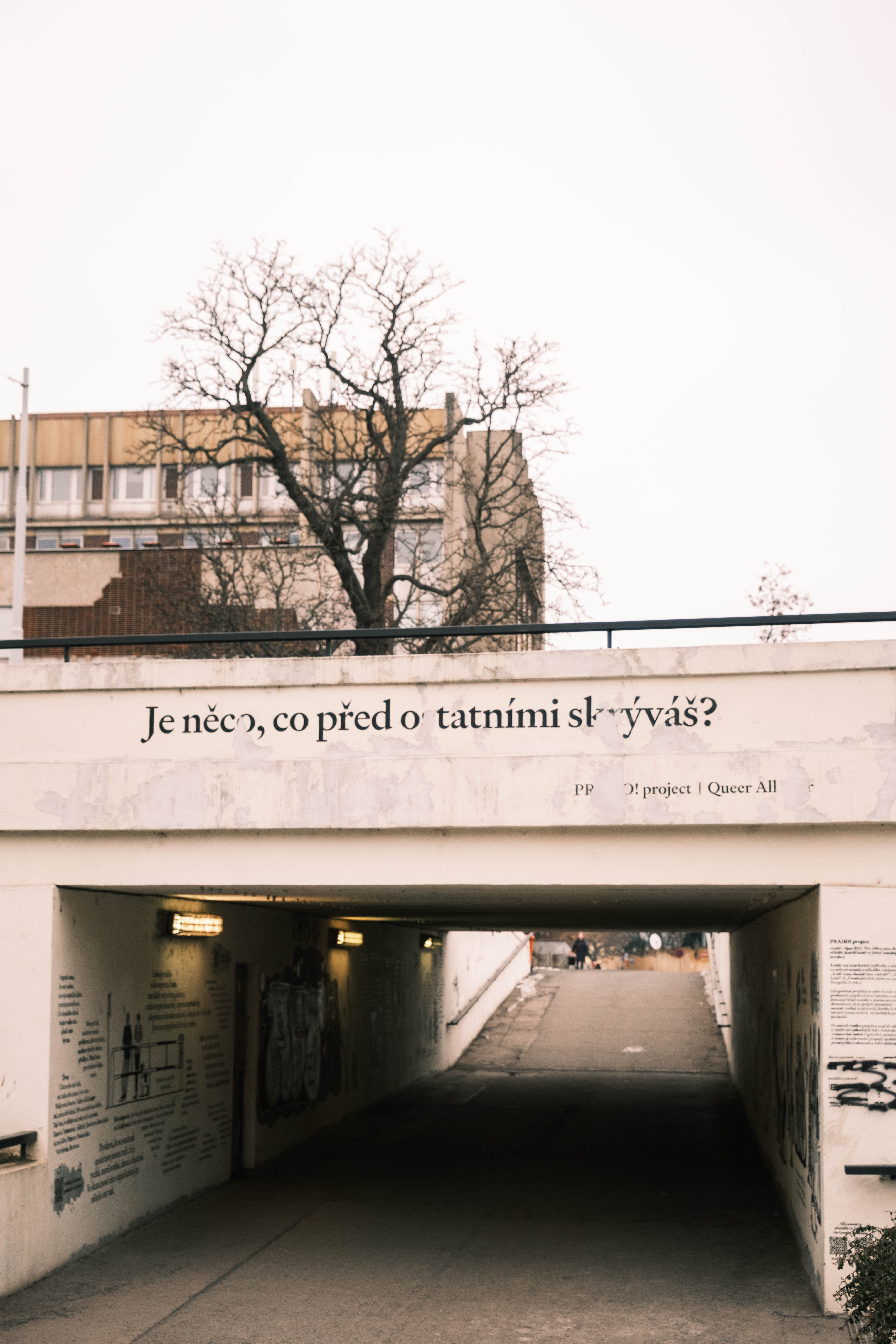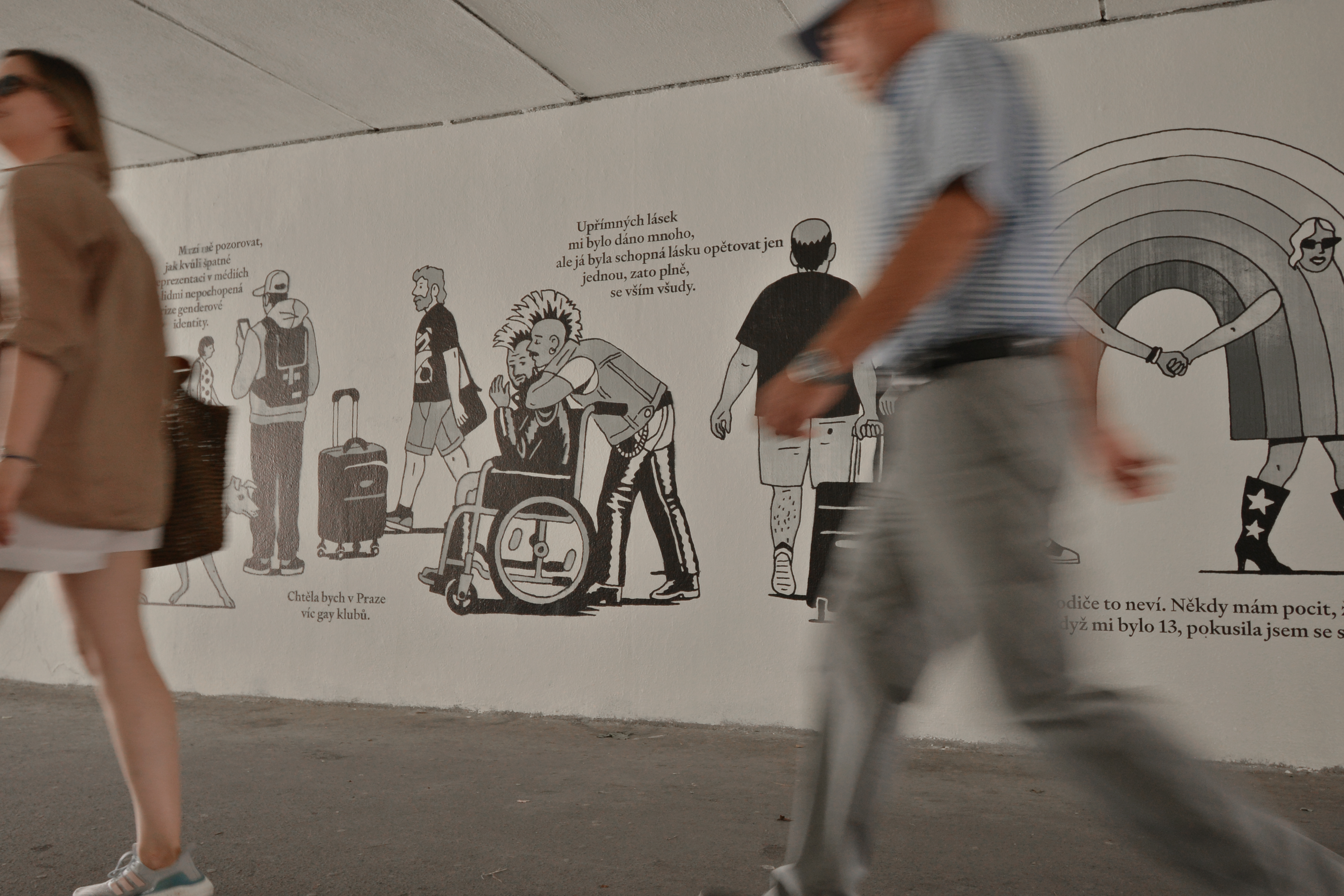 Děkuju za tenhle projekt! Podchodem občas chodím k fakultě, a přijde mi důležitý něco takovýho mít "jen tak" ve veřejném prostoru, kde si to může prohlédnout každý - ať už tam jde cíleně, nebo na to náhodou narazí <3