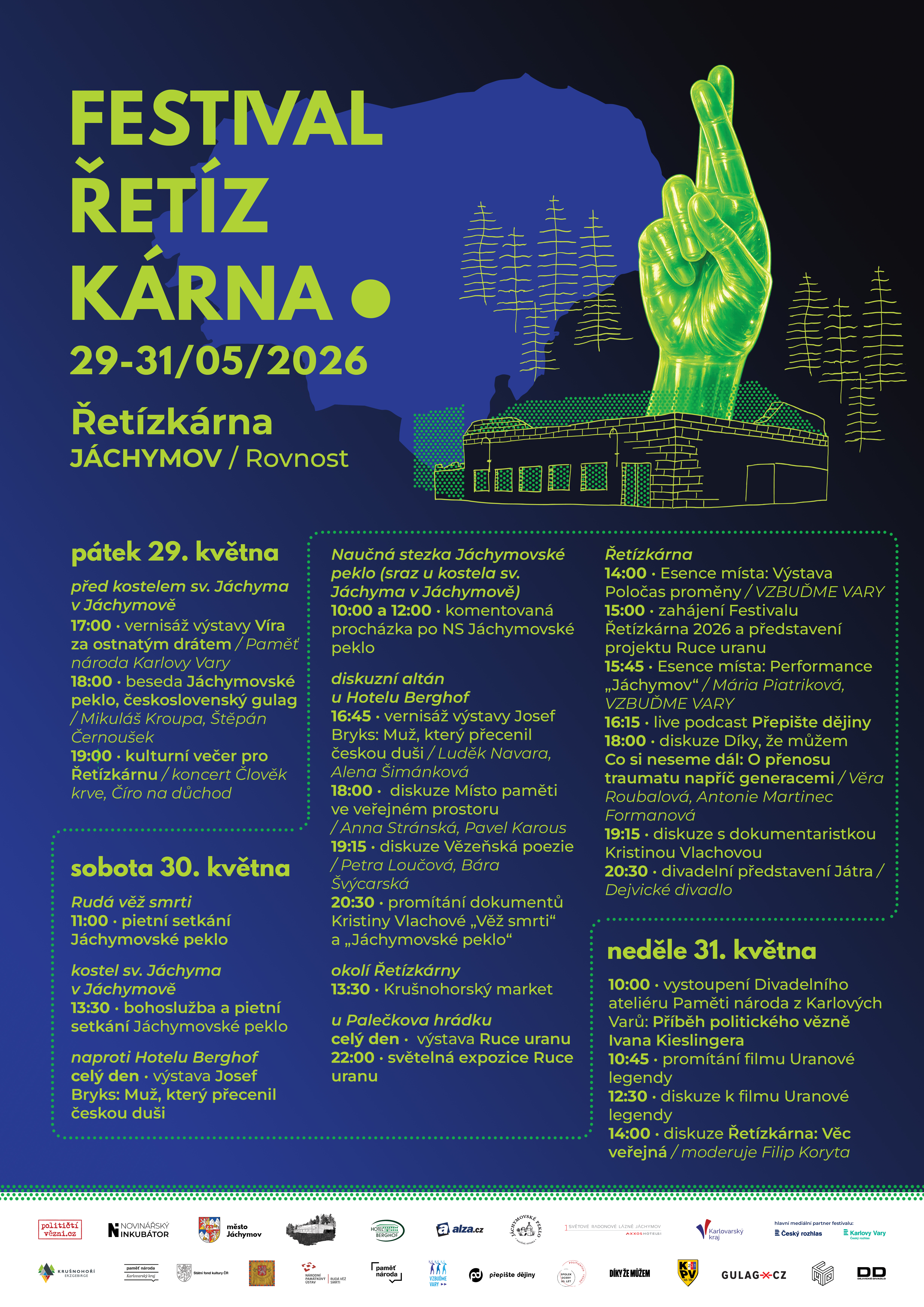 Přispějte na kulturu v Řetízkárně. Podpořte Festival Řetízkárna 2026 v Jáchymově – tři dny plné divadla, koncertů, diskuzí a setkání na místě s jedinečnou historií. Pomůžete tak oživit bývalou důlní převlékárnu z 50. let minulého století jako prostor pro kulturu, vzdělávání a sdílení příběhů.