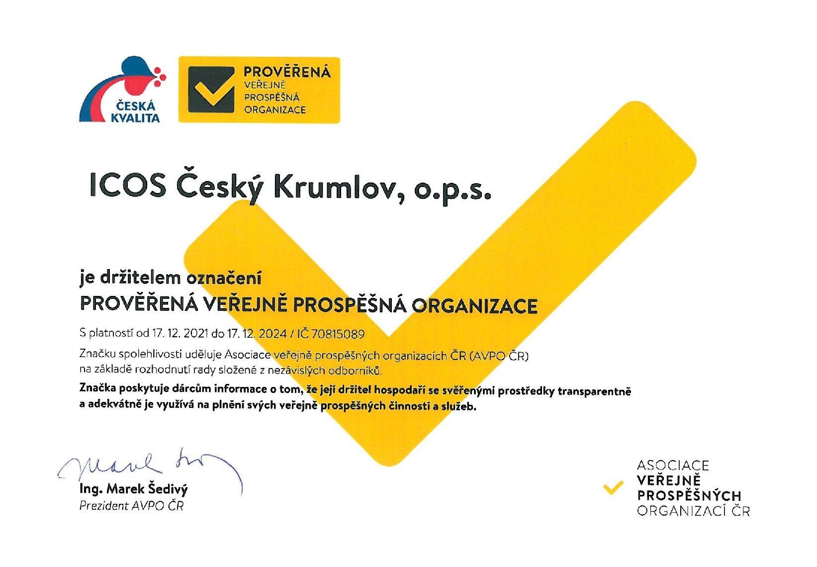 Zřizovatel Rodinného centra ICOS Český Krumlov, o.p.s. je držitelem Značky Spolehlivosti, kterou obdržel koncem roku 2021 a ICOS se tak zařadil ke 24 organizacím v ČR, které prošly nezávislým hodnocením a mohou se pyšnit titulem “Prověřená veřejně prospěšná organizace”.
