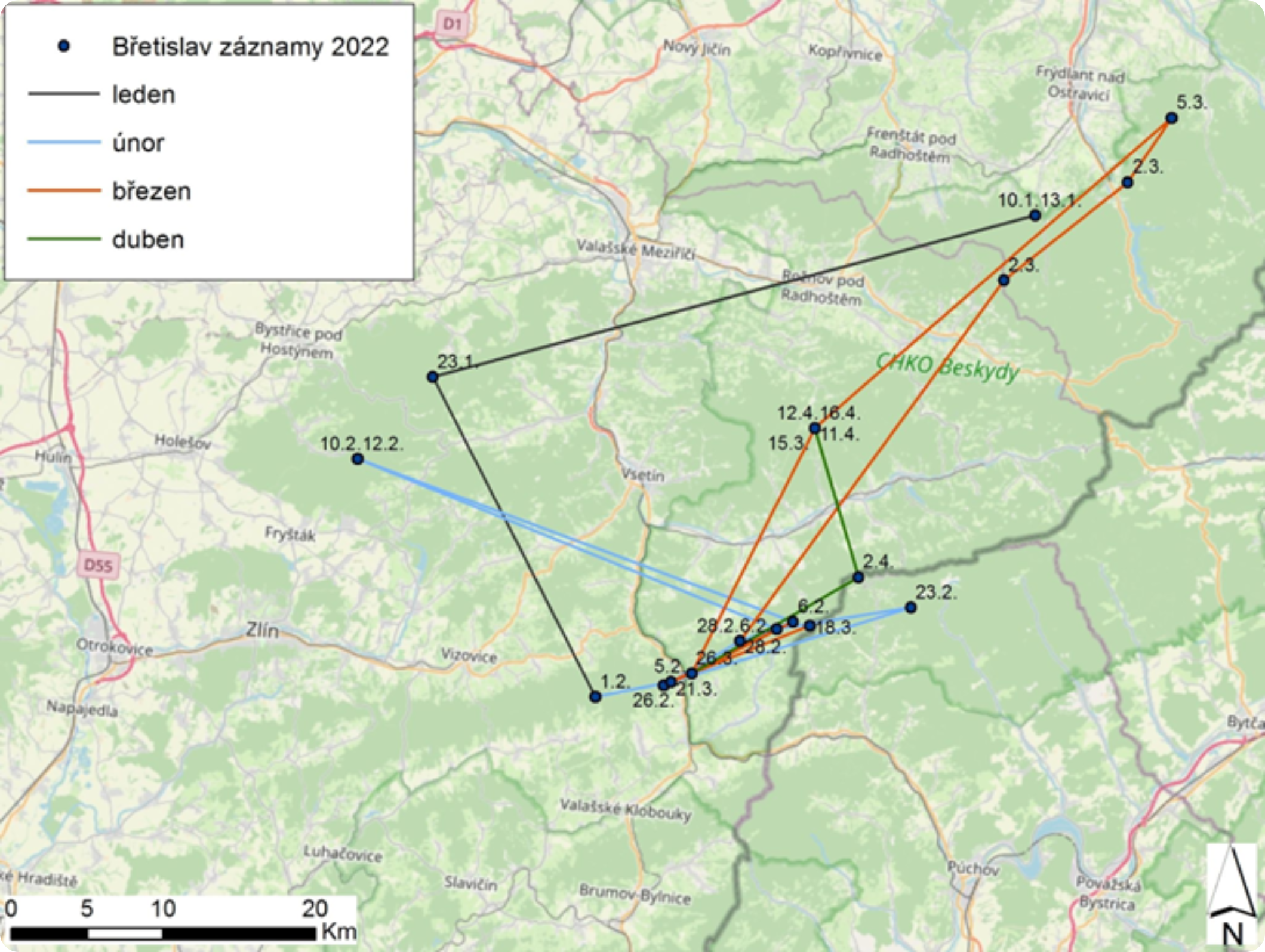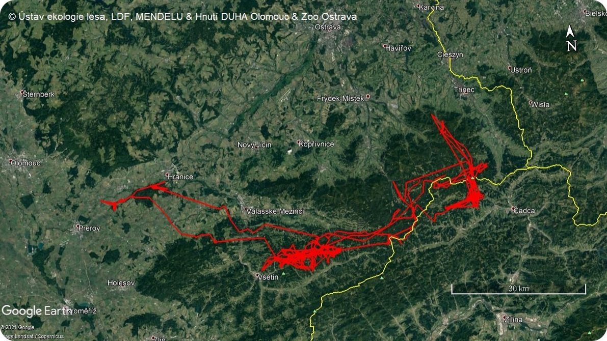 Jeho cesta byla pozoruhodná – díky sledovacímu GPS obojku jsme zjistili, že během jediného roku prošel Lipníkem nad Bečvou, Hostýnskými vrchy, Vsetínskými i Moravskoslezskými Beskydy až do slovenských Kysuc.