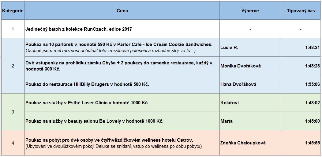 Pokud naleznete své jméno a čas v níže přiložené tabulce, gratuluji Vám k výhře jedné z cen v tipovací soutěži :-).