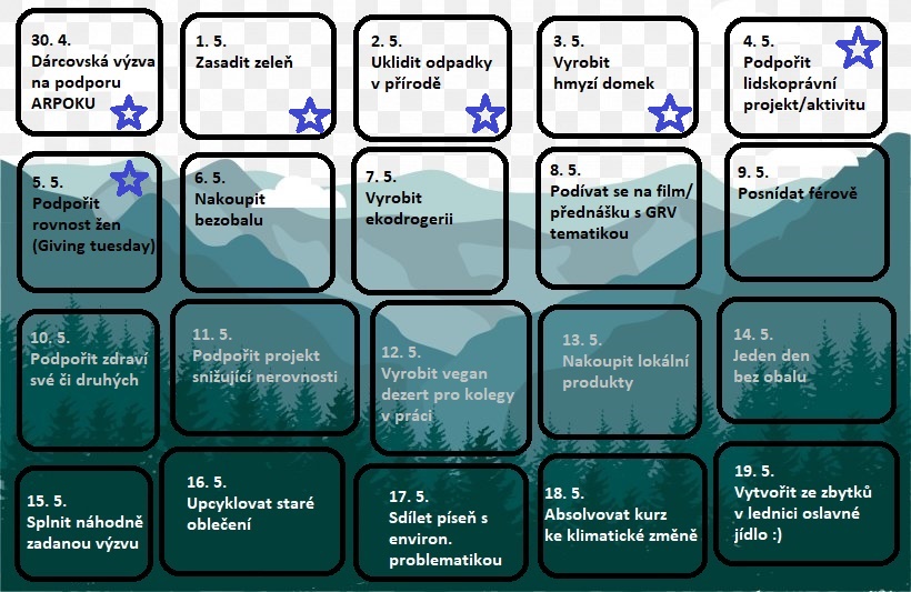 K dnešku je splněno 6/20 úkolů. Od vytvoření dárcovské výzvy, přes výsadku kvetoucích rostlin pro rozšíření druhové pestrosti pro včelky, sběr odpadků v okolí místního potoku, výroby hmyzího domku, podepisování petic na ochranu lidských práv až po podporu vzdělání dívek v Indii.