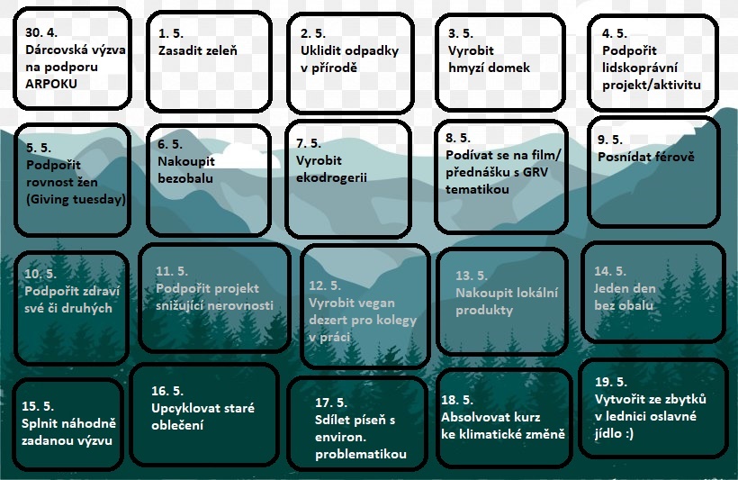 Cílem výzvy je splnit 20 drobných úkolů, které se nějakým způsobem dotýkají globálních témat. Od těch environmentálních, přes sociální i ekonomických. Věřím, že každý člověk má možnost i s pomocí drobných skutků rozvíjet sebe i společnost. Klíčové k tomu je vzdělávání, kterému se věnuje také organizace ARPOK. Vizí ARPOKu je podílet se na udržitelném rozvoji světa a na vytváření společnosti, která je Aktivní, Respektující a Otevřená, vnímá Propojenost a Komplexnost světa a přijímá svůj díl odpovědnosti.