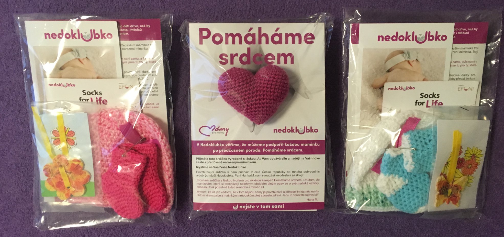 I my jsme byli v situaci, kdy jsme hledali informace a pomoc. I naše děti se narodily předčasně. Do všech 25 perinatologických center intenzivní a intermediální péče a šesti dalších zapojených nemocnic distribuujeme naše léčivé balíčky pro maminky a Čepičky na doma. Náš Léčivý balíček obsahuje: Nové vydání časopisu Nejste v tom sami, omalovánky Devatero sil, které provází miminka do dlaně, Pomáháme srdcem - povzbuzující text klinické psycholožky s ručně háčkovaným purpurovým srdíčkem a také naši narozeninovou novinku: 18 rad Nedoklubka, jak zvládnout první dny po předčasném porodu. Reálné náklady na tisk materiálů a celofánový obal je 33 Kč/balíček. Háčkovaná srdíčka a čepičky získáváme díky zručným tvořilkám darem. Za to jim patří náš obrovský dík! Dárky distribuujeme zdarma díky společnosti Zásilkovna již třetím rokem! Moc si této podpory vážíme!