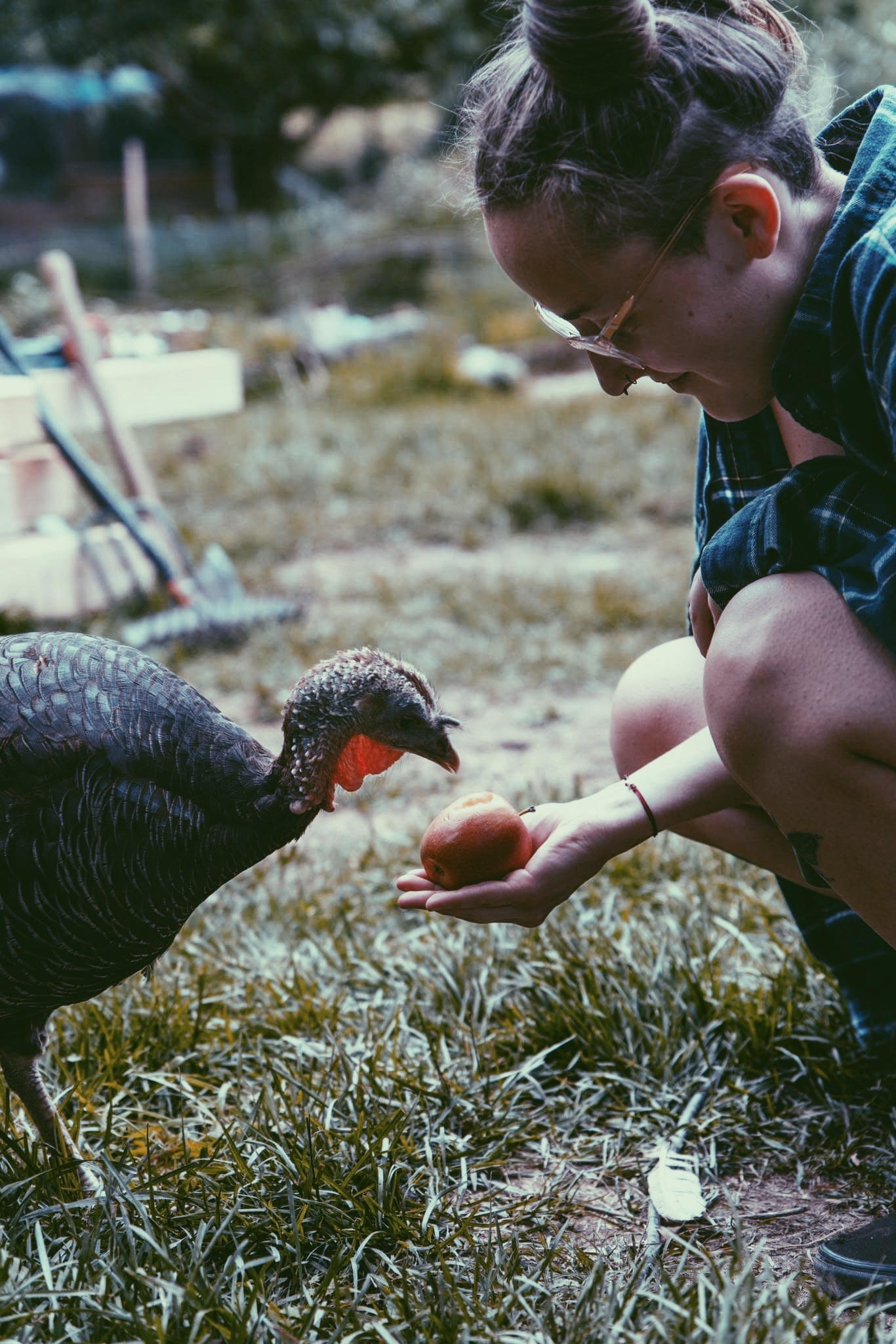 Ďobka, stejně jako ostatní slepičky u nás pochází z klecového chovu vaječného průmyslu, kde byla nucena žít v prostoru, ve kterém nemohla ani roztáhnout křídla. Bylo fascinující pozorovat okamži, kdy poprvé za svůj život vylezla ven a spatřila světlo, trávu a ucítila čerstý vzduch. Chybělo jí peří, měla přerostlé drápky, byla zesláblá a také psychicky poznamenána. Dnes je z ní veliká, silná slepička plná energie, je tak trochu přidrzlá a ráda do všeho a do všech ďobe. :-)
