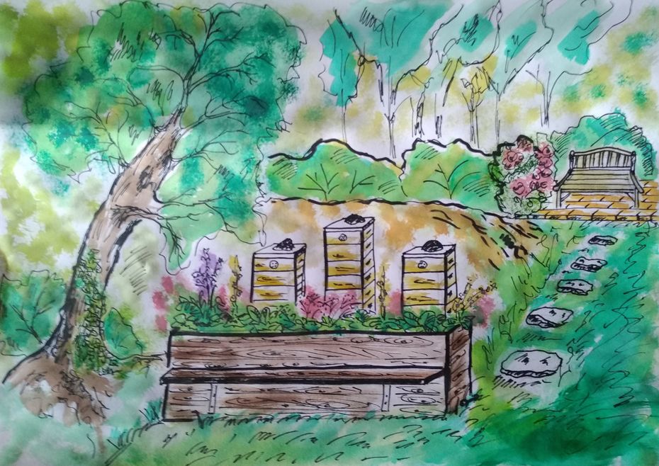 včelí pozorovatelnu s posezením, kde budou moci děti, návštěvníci zahrady i účastníci kurzu sledovat pohyb včel a sběr pylu na medonosných rostlinách