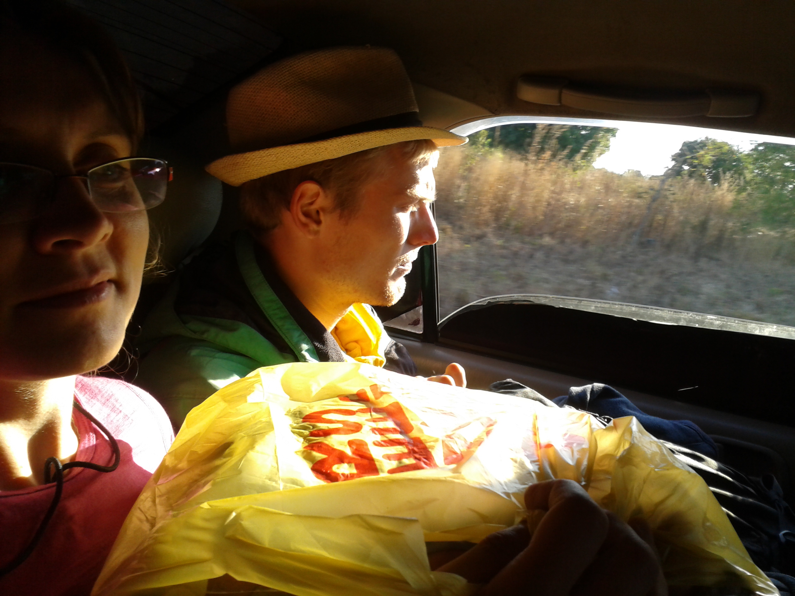 Pak jsme jeli autobusem 4,5 hodiny do Kapiri Mposhi. Zde jsme nakoupili potraviny v supermarketu a jeli autem 40 km do Kashitu. Auto bylo malé, tak jsme v něm se vším zbožím byli jak sardinky! :-D