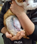 Losínka zranila sekačka při kosení luk. Kocourek je v šoku a noha neslučitelná se záchranou. Ihned dostal veškeré potřebné medikamenty a podstoupil amputaci. Nyní je v naší péči na rekonvalescenci.