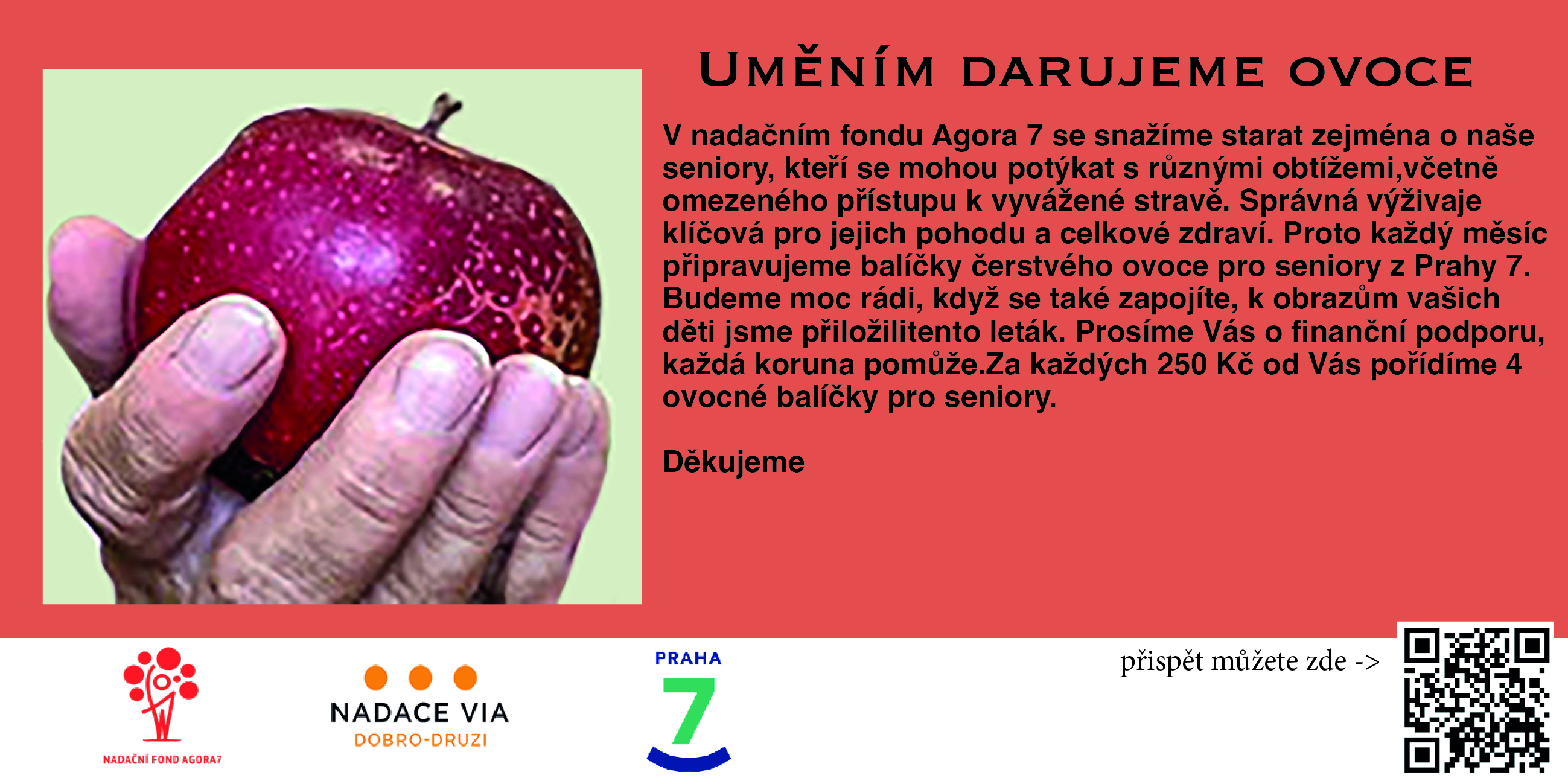 Pomáháme seniorům zajistit pravidelný přísun ovoce, které prospívá jejich zdraví. Partnerské organizace Charita Praha 7, Pečovatelský dům Praha 7 a Armáda Spásy podporujeme ročně částkou 240 000Kč. V průměru ročně rozdáme 2900kg ovoce ve formě 2520 balíčků pro 210 seniorů.