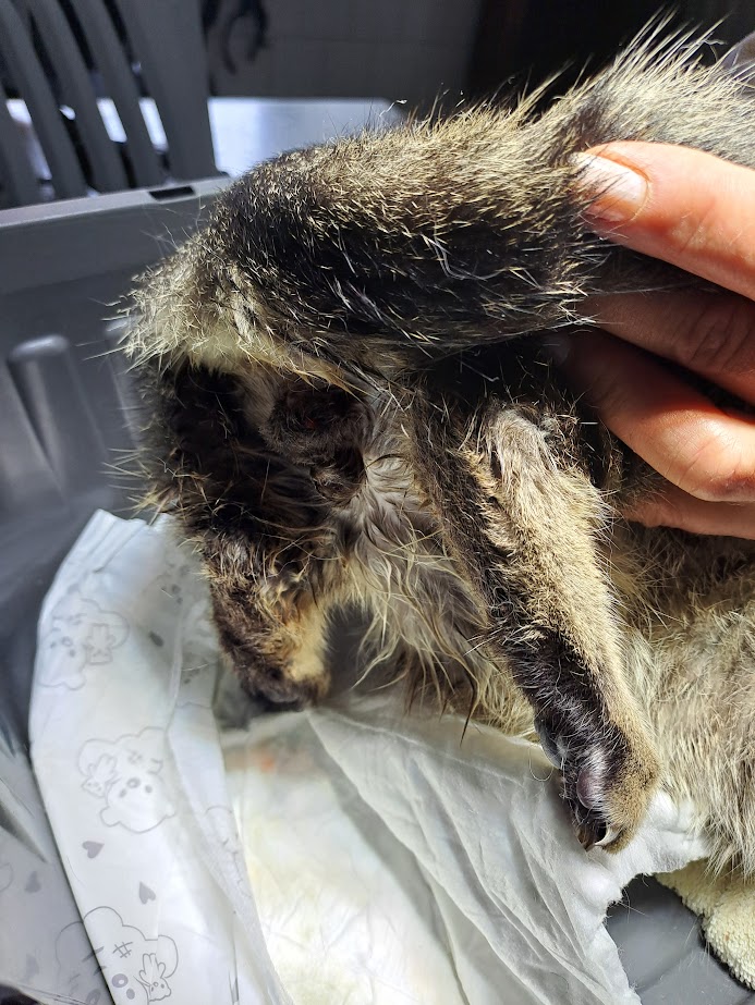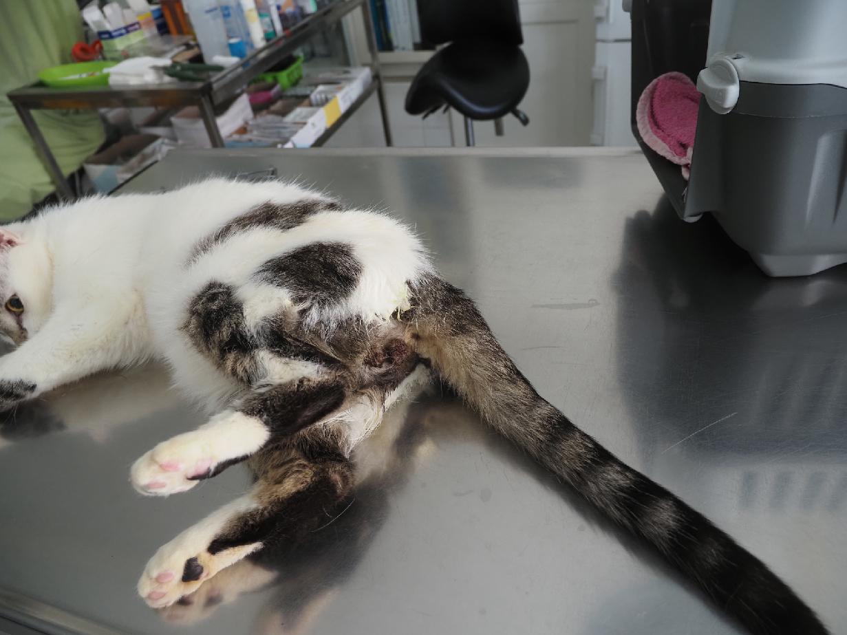 Losínka zranila sekačka při kosení luk. Kocourek je v šoku a noha neslučitelná se záchranou. Ihned dostal veškeré potřebné medikamenty a podstoupil amputaci. Nyní je v naší péči na rekonvalescenci.