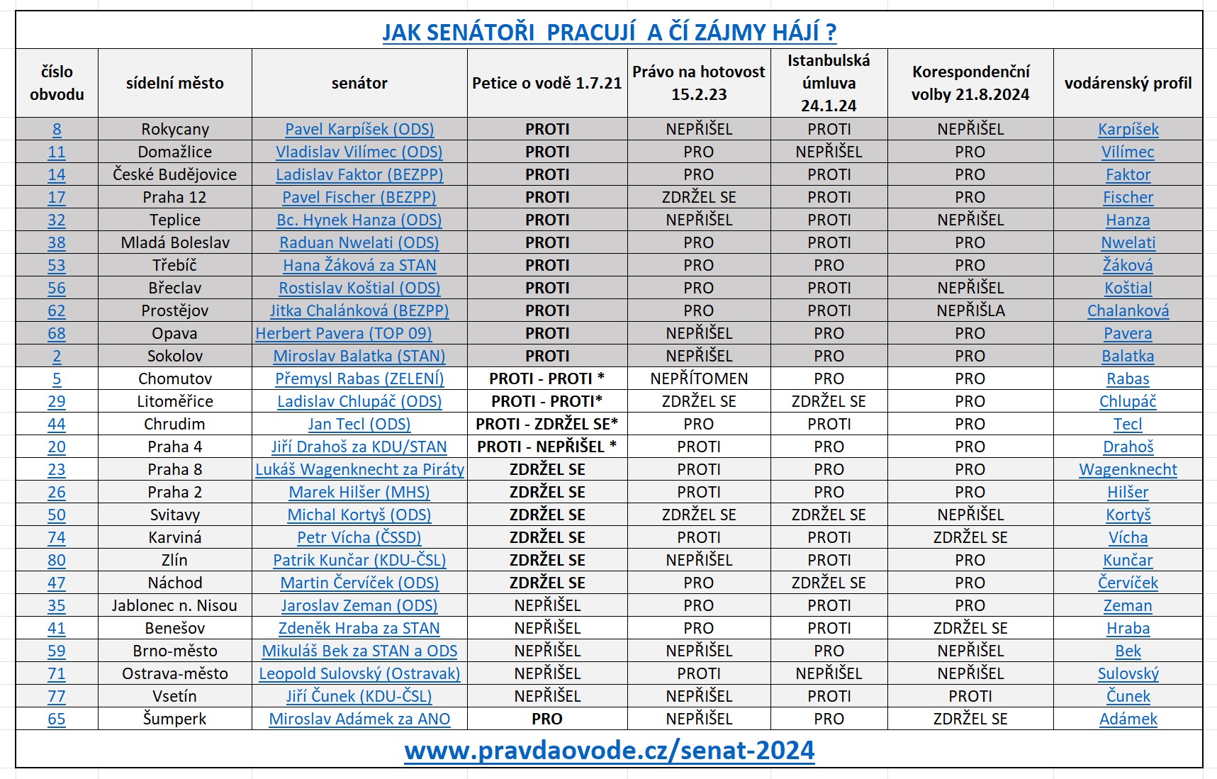 Každý z 27 senátorů, kterému končí mandát, má navíc u nás svůj vodárenský profil, z kterého plyne, co 6 let od nás k vodě dostal, co dělal pro nápravu a zda hlasoval PRO nebo PROTI nápravě. TABULKA je zde: www.pravdaovode.cz/pustme-politiky-k-vode