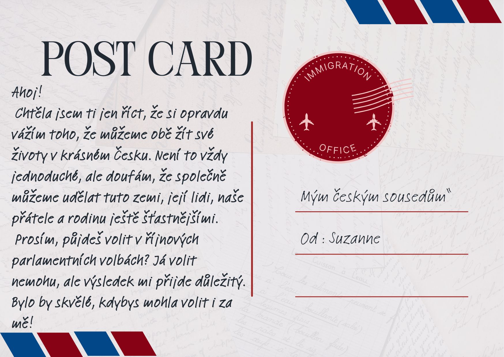 Můj projekt s názvem „Pohlednice od cizích Čechů / Postcards from Foreign Czechs“ zve Čechy i cizince k posílání pohlednic, které budou povzbuzovat české přátele, sousedy a známé k volbám. Mnoho obyvatel Česka s migračním původem nemá volební právo, což znamená, že jejich hlasy a obavy nejsou dostatečně zastoupeny. Přesto výsledky voleb – zejména blížících se voleb do Poslanecké sněmovny v říjnu 2025 – ovlivňují jejich životy stejně jako životy ostatních. Mým cílem je vytvořit jednoduchý a přátelský způsob, jak motivovat ostatní k účasti ve volbách, s dodatkem, aby zohlednili i perspektivy migrantů. Tento projekt je inspirován americkými kampaněmi, jako je Blue Wave Postcard Movement nebo Markers for Democracy, které podporují volební účast.