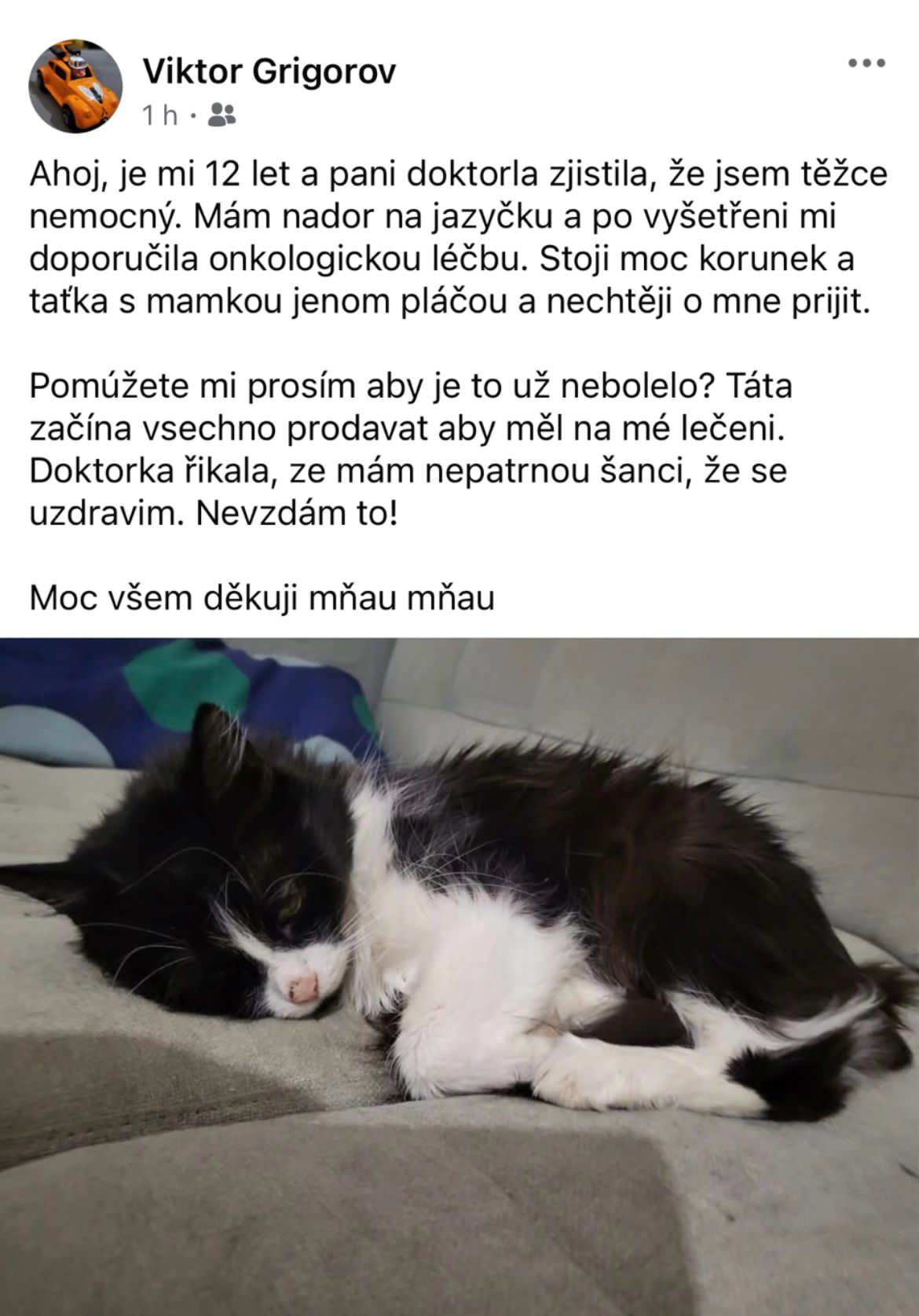 Patří mé bývalé přítelkyni, která už není mezi námi, ale stále ji v něm vidím. A právě proto mi na něm tolik záleží💛. Ztráta Jonáška by pro mě znamenala ztrátu i posledních vzpomínek na ni, což je pro mě nesmírně těžké😔. Nedávno mi v Animed Brno řekli, že Jonášek trpí vážnou nemocí 💔. Na 99 % se jedná o SCC (squamous cell carcinoma), což je agresivní rakovina, která se nachází na jeho jazyku 😞 Bohužel, operace není možná, a pokud mu neposkytneme léčbu, bude to pro něj nesnesitelné 😢. A právě proto se na vás obracím s prosbou o pomoc 🙏. Chci mu dát šanci na lepší život a bojovat o něj🐱 💞. Léčba je velmi nákladná a pro mě samotného je to finančně neúnosné. Tato sbírka je pro Jonáška, který si zaslouží ještě pár krásných dnů plných lásky a péče 🐾❤️. Pomozte nám, prosím, dát mu šanci na život 🌟. Každý příspěvek, i ten nejmenší, je pro nás obrovskou podporou 🙌.