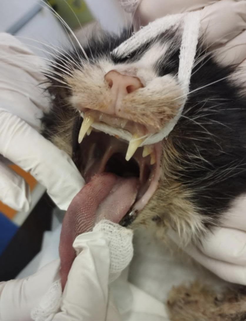Kocourek je docela zanedbaný a špinavý, a přestože mu lezou obratle, je docela statné konstituce a nijak extra pohublý. Pokud byl někde někým krmený, tak určitě nedostával komplexní péči, protože má zahnisané oko a dezolátní zuby (jeden špičák uražený, druhý skoro černý). Je nekastrovaný a v jednom uchu má svrab. Co je ale horší, tak že se snaží ulevovat zadním nohám - při prohmatání to vypadá na přetržený vaz nebo totální luxaci pately. K tomu klopí hlavu na stranu a chodí trochu nemotorně. Více ukáže vyšetření s rengeny, ale je docela možné, že v minulosti prodělal nějaký větší úraz (může to ale také být větší zánět nebo polyp v uchu). Zítra jsme objednaní na komplexní vyšetření a úřad městské části nám slíbil vyhlášení nálezu. Jakmile budeme vědět více, budeme vás informovat.
