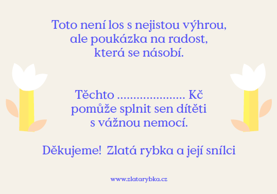 Víte, že by oslavenci udělalo radost, když by se o svůj dárek mohl podělit? Darujte naší Zlaté rybce libovolnou částku, která pomůže splnit sen dítěti s vážnou nemocí. Po zvolení typu platby budete mít možnost napsat nám do poznámky, pro koho certifikát je a kam ho máme zaslat a my už se postaráme o to, aby došel do správných rukou i s malým překvapením od nás.