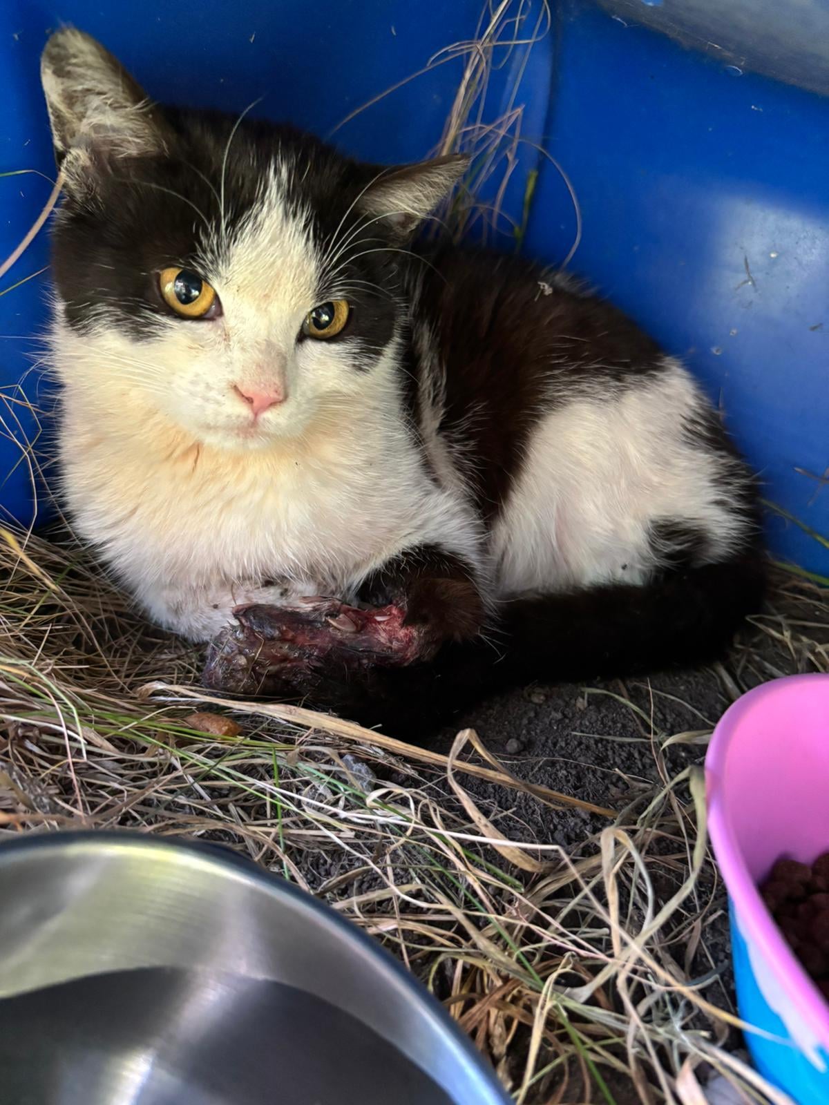 Losínka zranila sekačka při kosení luk. Kocourek je v šoku a noha neslučitelná se záchranou. Ihned dostal veškeré potřebné medikamenty a podstoupil amputaci. Nyní je v naší péči na rekonvalescenci.