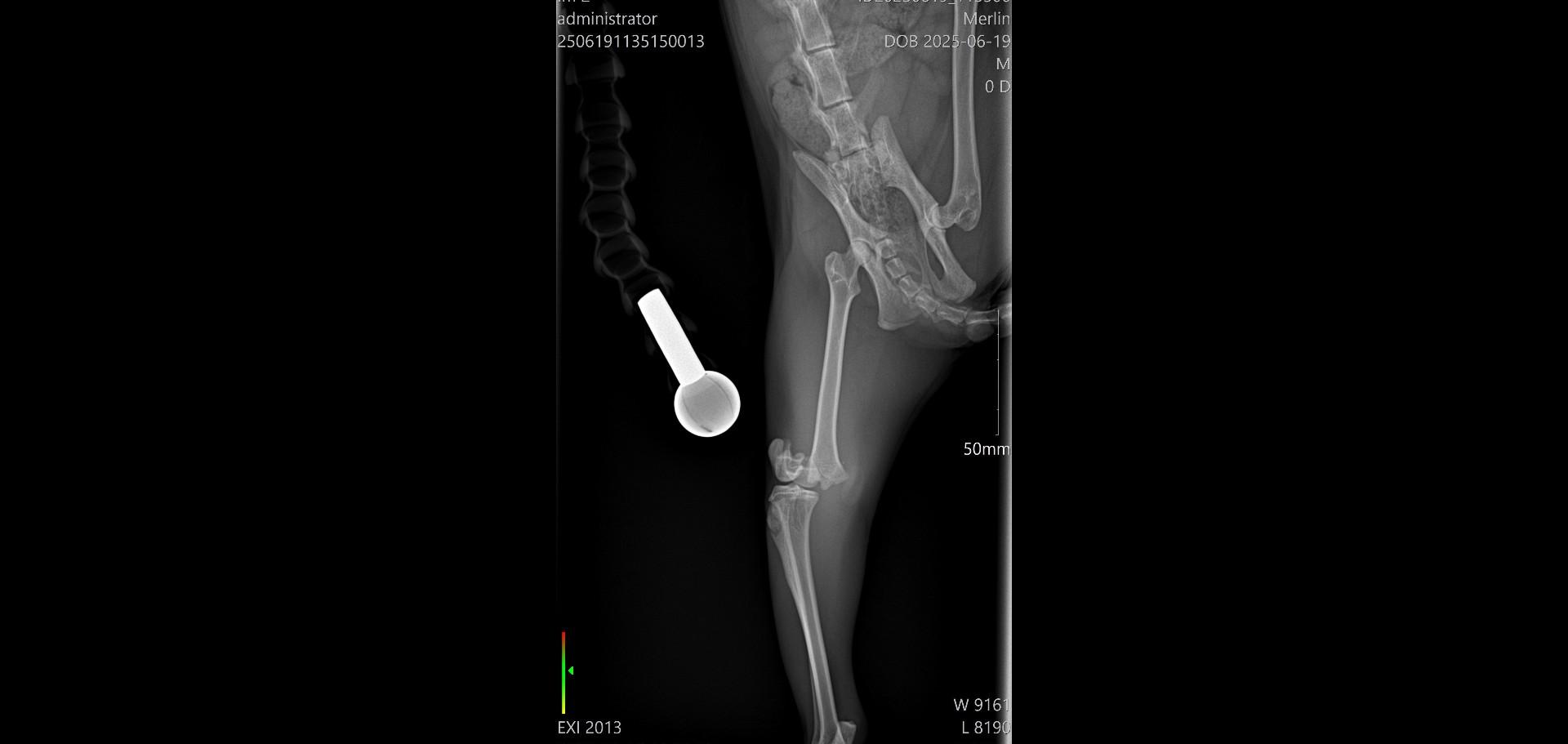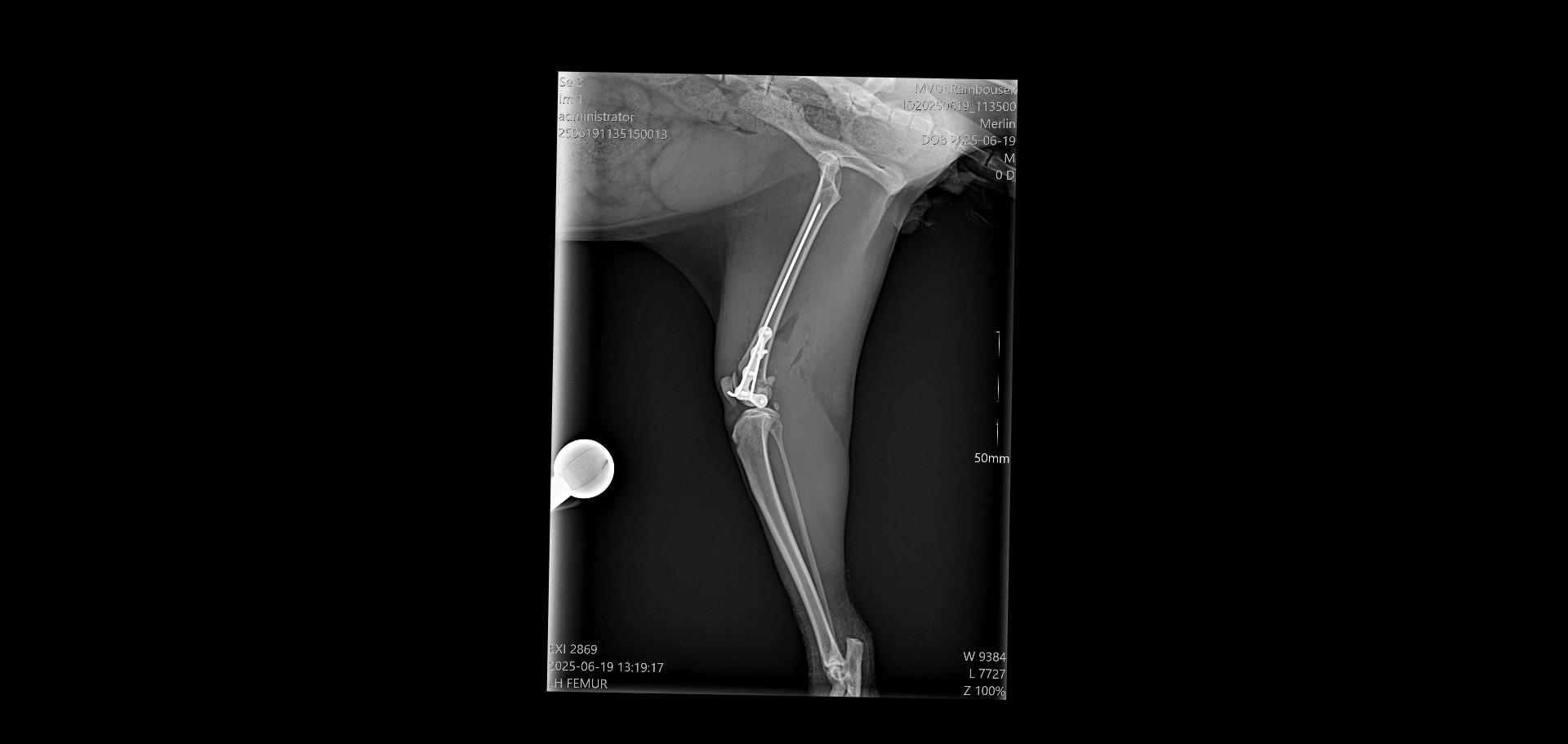Dnes ráno měl být Merlinek propuštěn do domácího léčení, bohužel jeho stav po narkóze neodpovídal běžnému stavu a musel ještě zůstat na klinice. Zítra budeme vědět víc a doufáme, že bude už v pořádku a pojede s námi domů, kde má vše připraveno na doléčení. Přikládáme snímky z rentgenu operované nožky. Děkujeme všem za podporu a pomoc s úhradu nákladů na operaci a hospitalizaci, které budou vysoké, bez vaší pomoci bychom to nezvládli.