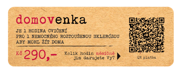 Letos chceme v Domově sv. Josefa vybrat 25 000 Domovenek – to je přesně tolik, kolik potřebujeme, aby všichni naši klienti měli zajištěnou potřebnou péči. Co je Domovenka? Jedna Domovenka za 290 Kč znamená dofinancování 1 hodiny terapie, která pomáhá lidem s roztroušenou sklerózou udržet soběstačnost, důstojnost a kvalitu života.