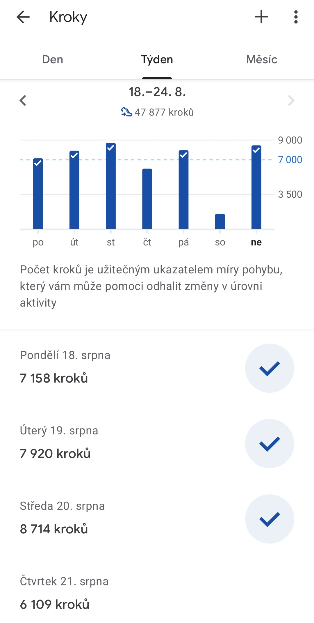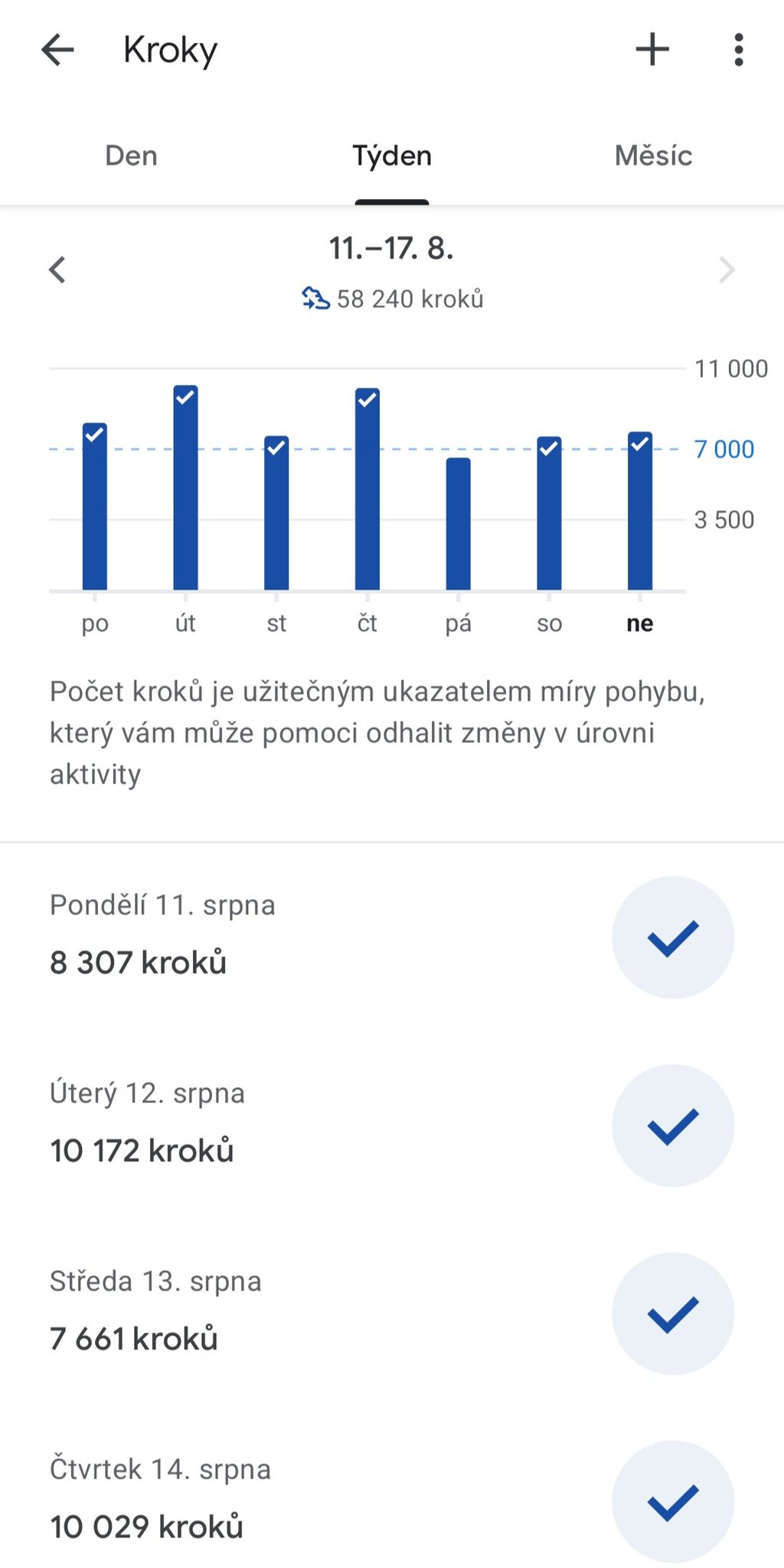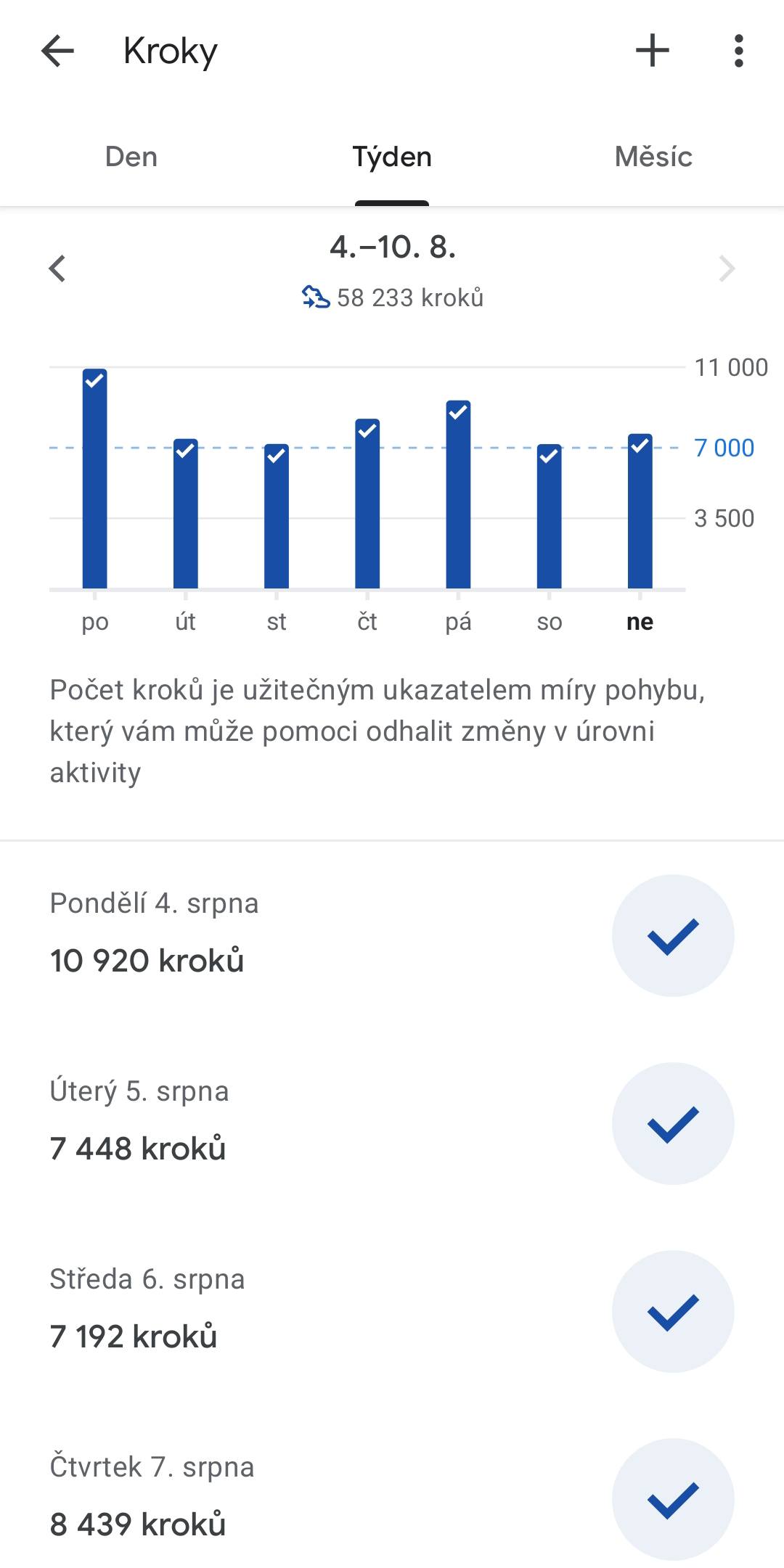 Mám za sebou první týden a v nohách 58 000 kroků. Pochopila jsem, že nejjednodušší je chodit do práce nebo na jiné schůzky pěšky, a pokud mě náhodou nenutí nic jít ven, je potřeba se jít alespoň na hodinu projít. Na tento systém se dá poměrně rychle zvyknout. Horší bylo, když jsem se zapovídala z pátku na sobotu s kamarádkou do ranních hodin a druhý den bych se byla nejradši válela a dospávala. Ale rozhodla jsem se, že i když mám nachozeno do zásoby, chci prostě denně ujít alespoň 7 tisíc kroků, tak jsem chodila i po hodně probdělé noci :) a v hlavě už vymýšlím, jestli jsem schopná zvýšit počet kroků na 8 tisíc denně už v září nebo až později. Děkuji všem, co přispěli, za podporu! Moc si jí vážím <3
