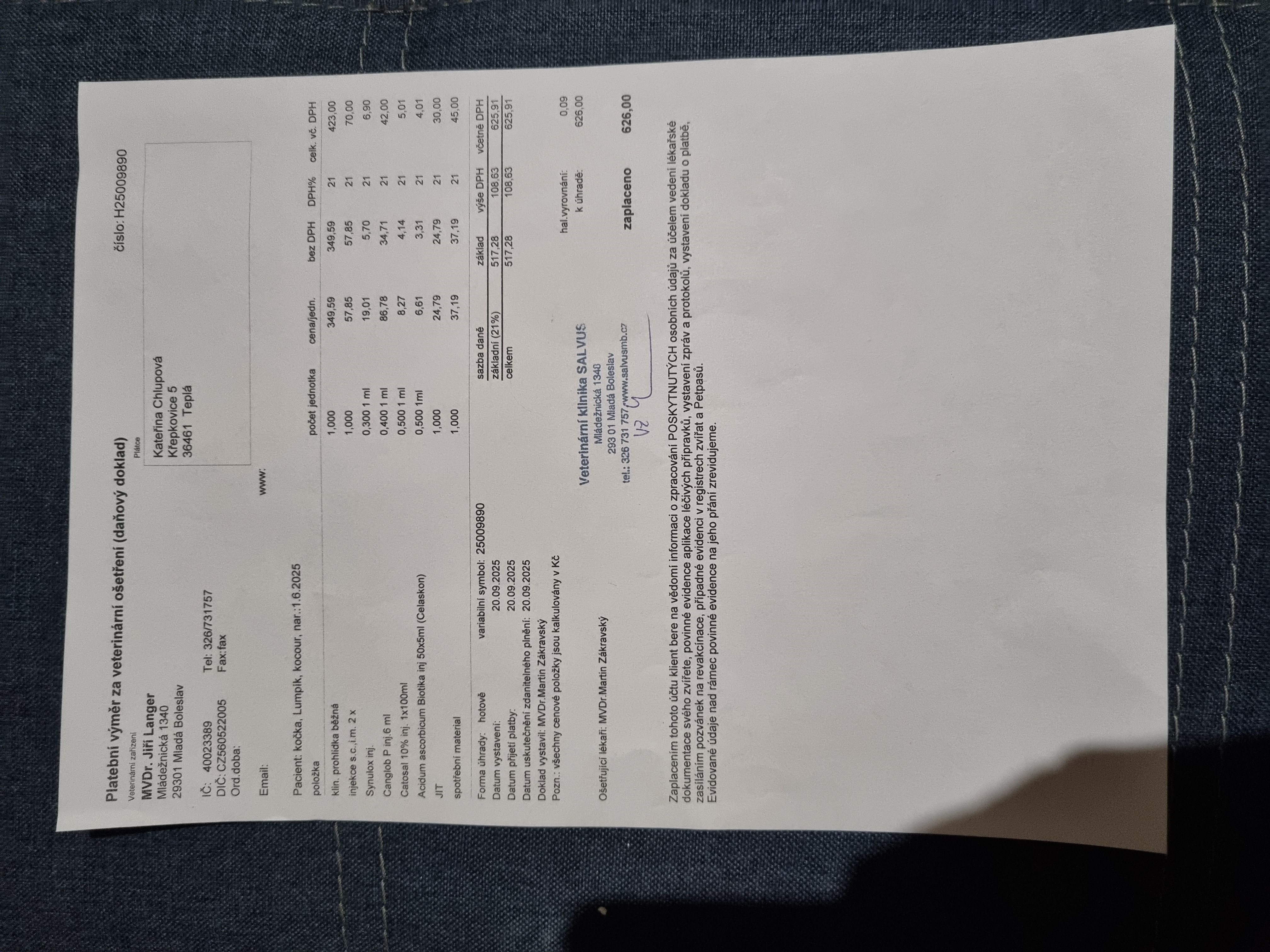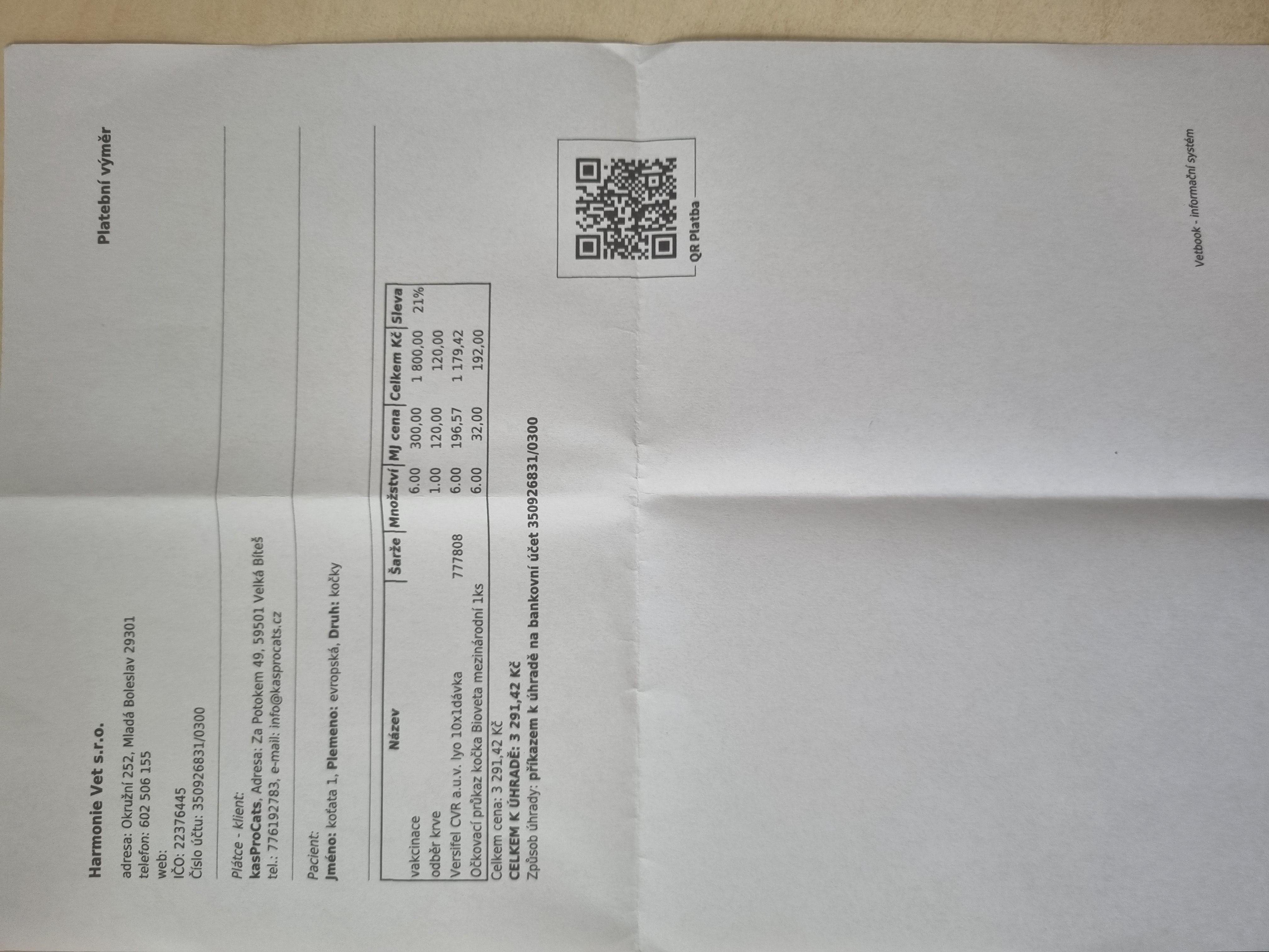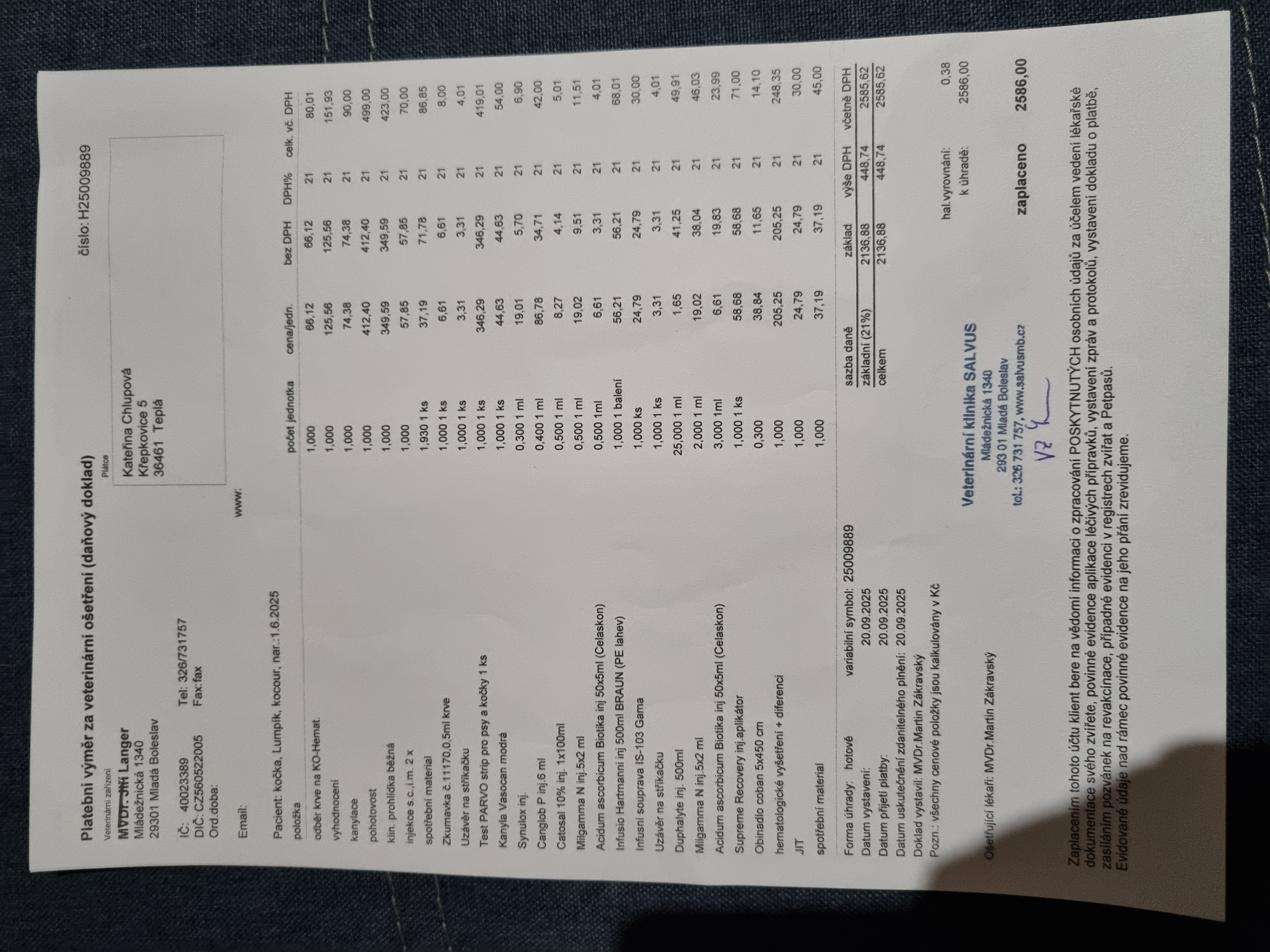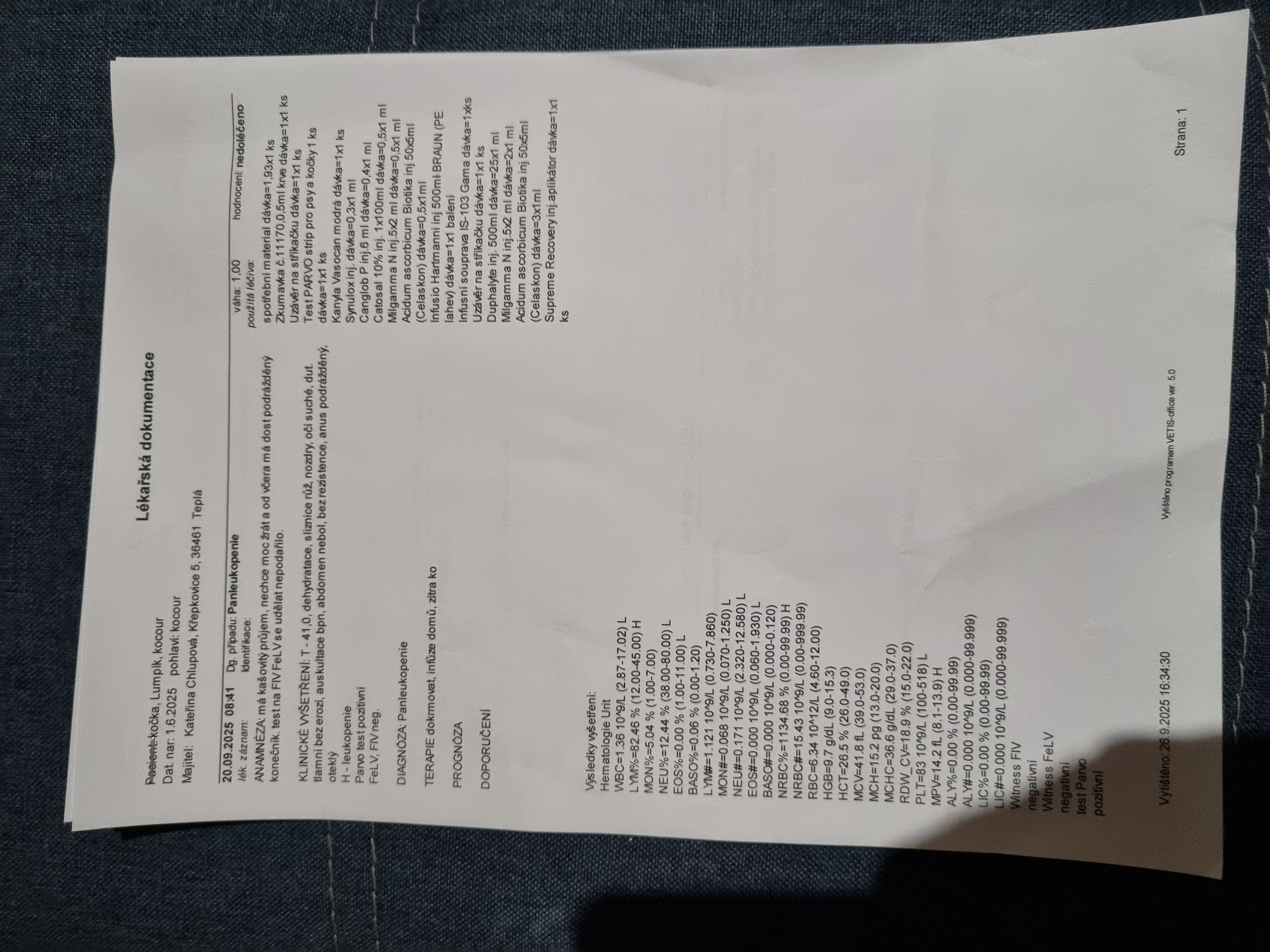 20.9. jsem si všimla u jednoho kotěte nechutenství a malátnosti. Čapla jsem ho a letěli jsme na nejbližsí veterinu, která sice nespolupracuje s Kasprem, takže jsem nemohla využít možnosti čerpat prostředky ze sbírky, přesto to stálo za to. Po prvotním šoku, když pan doktor naměřil teplotu 41 stupňů a na testu se ukázalo, že je kotě pozitivní, zavládlo čiré zoufalství jak to zvládnu, strach o další koťata, která mám v domácnosti a nakonec vztek. Vztek, že bojuji s větrnými mlýny, ale nakonec jsem opět přepla do módu, naděje umírá poslední. Zdravě jsem se naštvala a postupovala systematicky, nejprve kotě připojit na kapačku, kterou jsem mu kapala doma, aby nemusel být zbytečně v cizím prostředí na veterině, dostat do něj přes stříkačku alespoň trochu jídla, podpurné doplňky, desinfekce celého bytu, jak jen to bylo možné. Druhý den se kotě samo najedlo, spadl mi kámen ze srdce, dostalo přepich antibiotik, doma opět infuze, dokrm, dopňky. Canglob jsem píchala už sama dalších 7 dní, do toho se mu ještě spustila rýma a zanět spojivek, ale díky ATB podávaným až do dneška, to nepropuklo v něco horšího. Dnes již můžu říct, že jsme toho kotěcího zabijáka v tomto případě porazili. držte nám pěsti, aby to takto dopadlo pokaždé. Léčba stála cca. 4000Kč. viz faktura a to nepočítám čas a energii, kterou jsme do toho prcka vložili. Mortalita u nakažených koťat je až 85%, pokud nedojde k rychlému lékařskému zásahu a nasazení adekvátní léčby. Mám v péči 11 koťat, kdyby se tato nemoc rozjela u všech, tak bych si takovouto léčbu bohužel nemohla dovolit. Proto děkuji všem, kteří se rozhodli a rozhodnou přispět na sbírku.