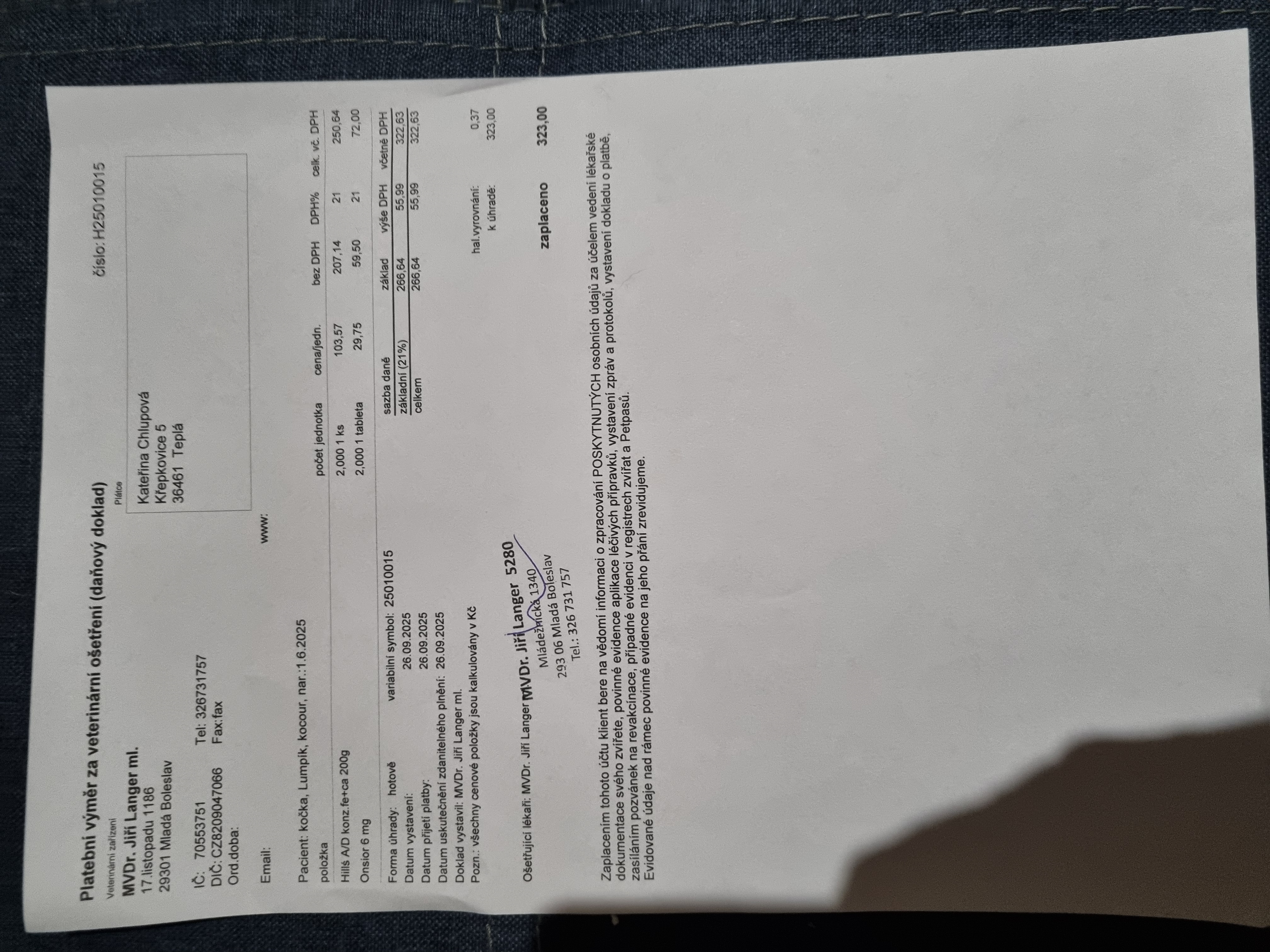 Financování: Na Tonyho léčbu se vybralo 12833Kč, náklady na léčbu byly 7390Kč, zbylá částka byla využita na kastrace toulavých koček.