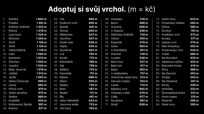 Vyber si jeden z mých 94 vrcholů a přispěj částkou odpovídající jeho nadmořské výšce.