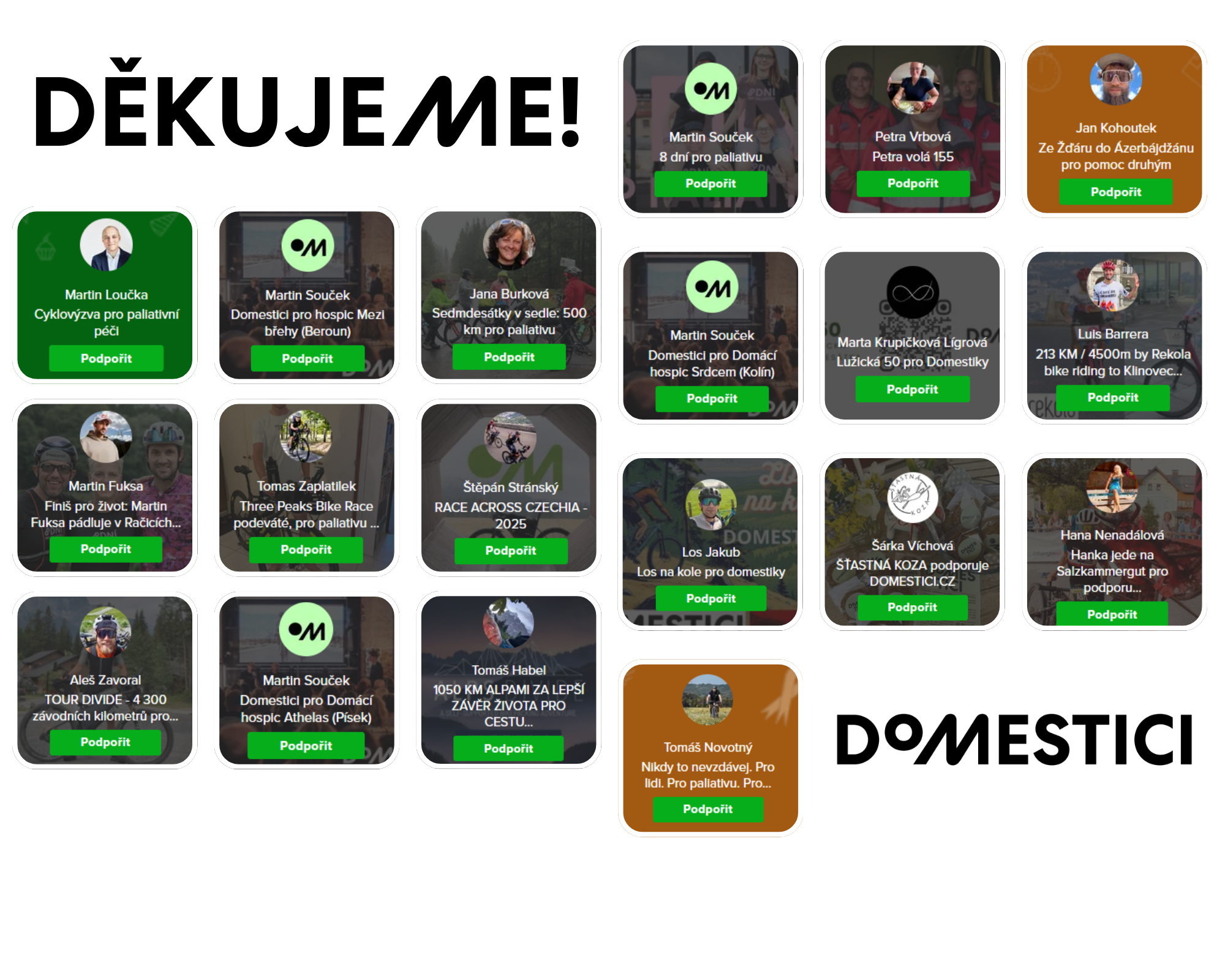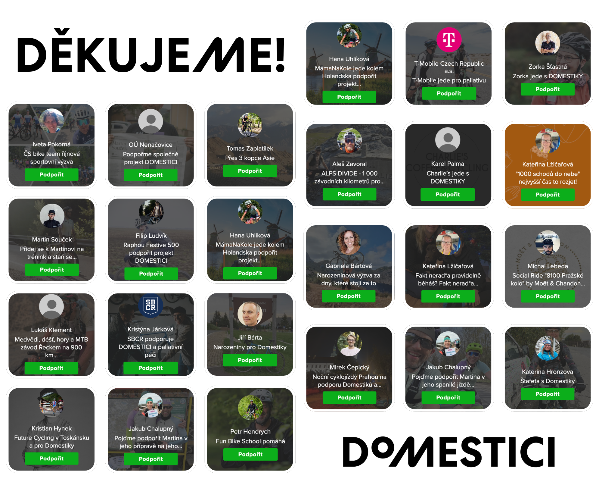 - Vytvořte si vlastní fundraisingovou výzvu dole na této stránce a zapojte své okolí! Propojte Domestiky se svou sportovní výzvou, akcí nebo příběhem.