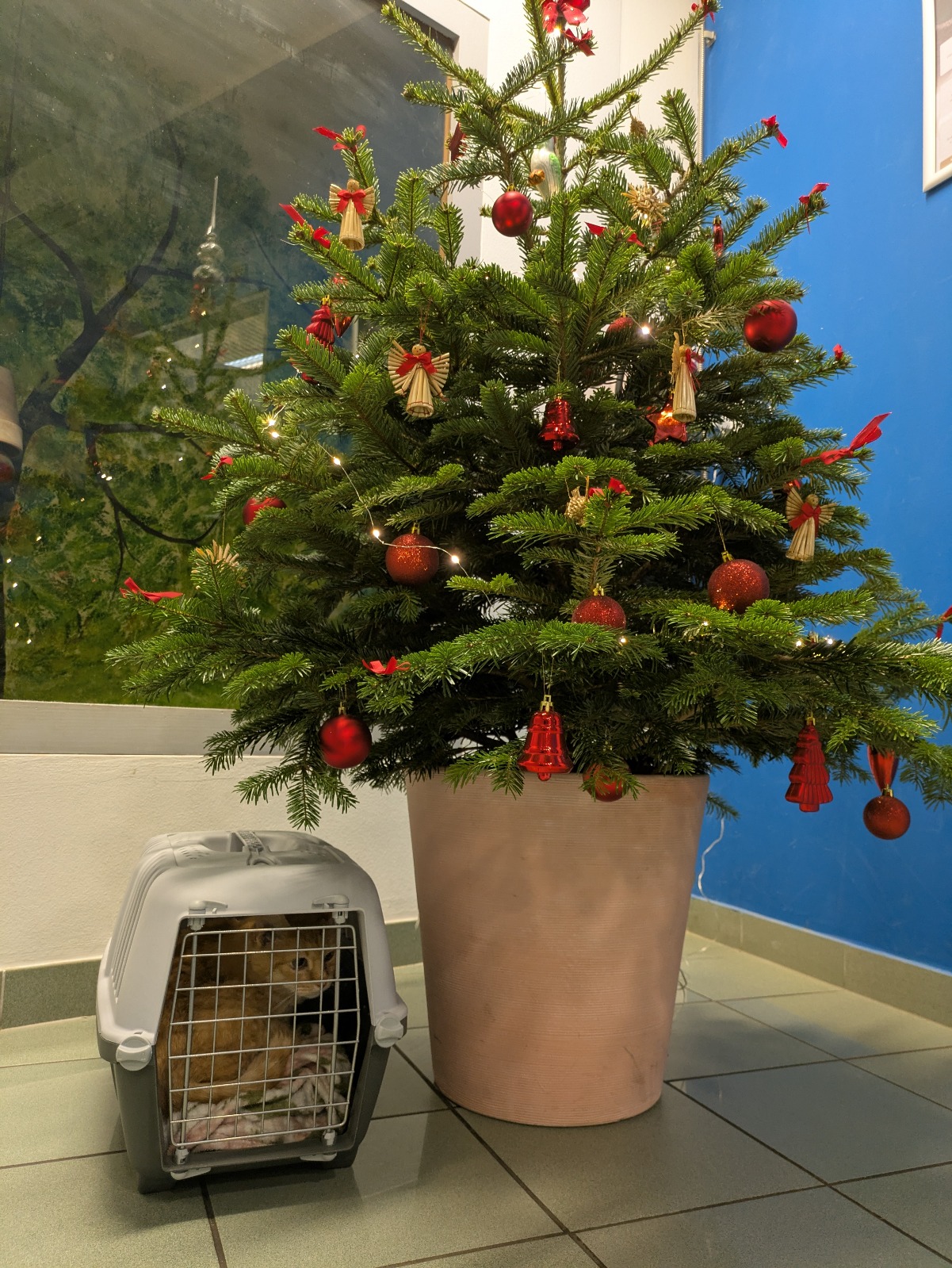 Kocourek je docela zanedbaný a špinavý, a přestože mu lezou obratle, je docela statné konstituce a nijak extra pohublý. Pokud byl někde někým krmený, tak určitě nedostával komplexní péči, protože má zahnisané oko a dezolátní zuby (jeden špičák uražený, druhý skoro černý). Je nekastrovaný a v jednom uchu má svrab. Co je ale horší, tak že se snaží ulevovat zadním nohám - při prohmatání to vypadá na přetržený vaz nebo totální luxaci pately. K tomu klopí hlavu na stranu a chodí trochu nemotorně. Více ukáže vyšetření s rengeny, ale je docela možné, že v minulosti prodělal nějaký větší úraz (může to ale také být větší zánět nebo polyp v uchu). Zítra jsme objednaní na komplexní vyšetření a úřad městské části nám slíbil vyhlášení nálezu. Jakmile budeme vědět více, budeme vás informovat.